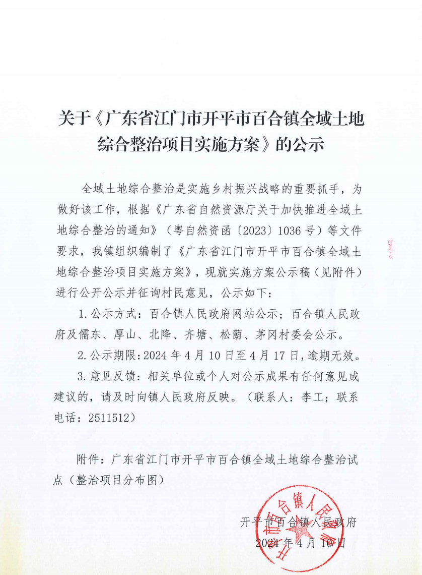 關于《廣東省江門市開平市百合鎮(zhèn)全域土地綜合整治項目實施方案》的公示
