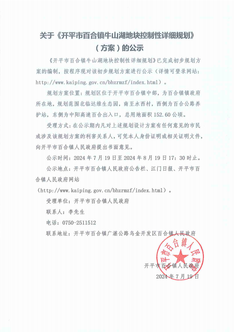 關(guān)于《開(kāi)平市百合鎮(zhèn)牛山湖地塊控制性詳細(xì)規(guī)劃》(方案)的公示