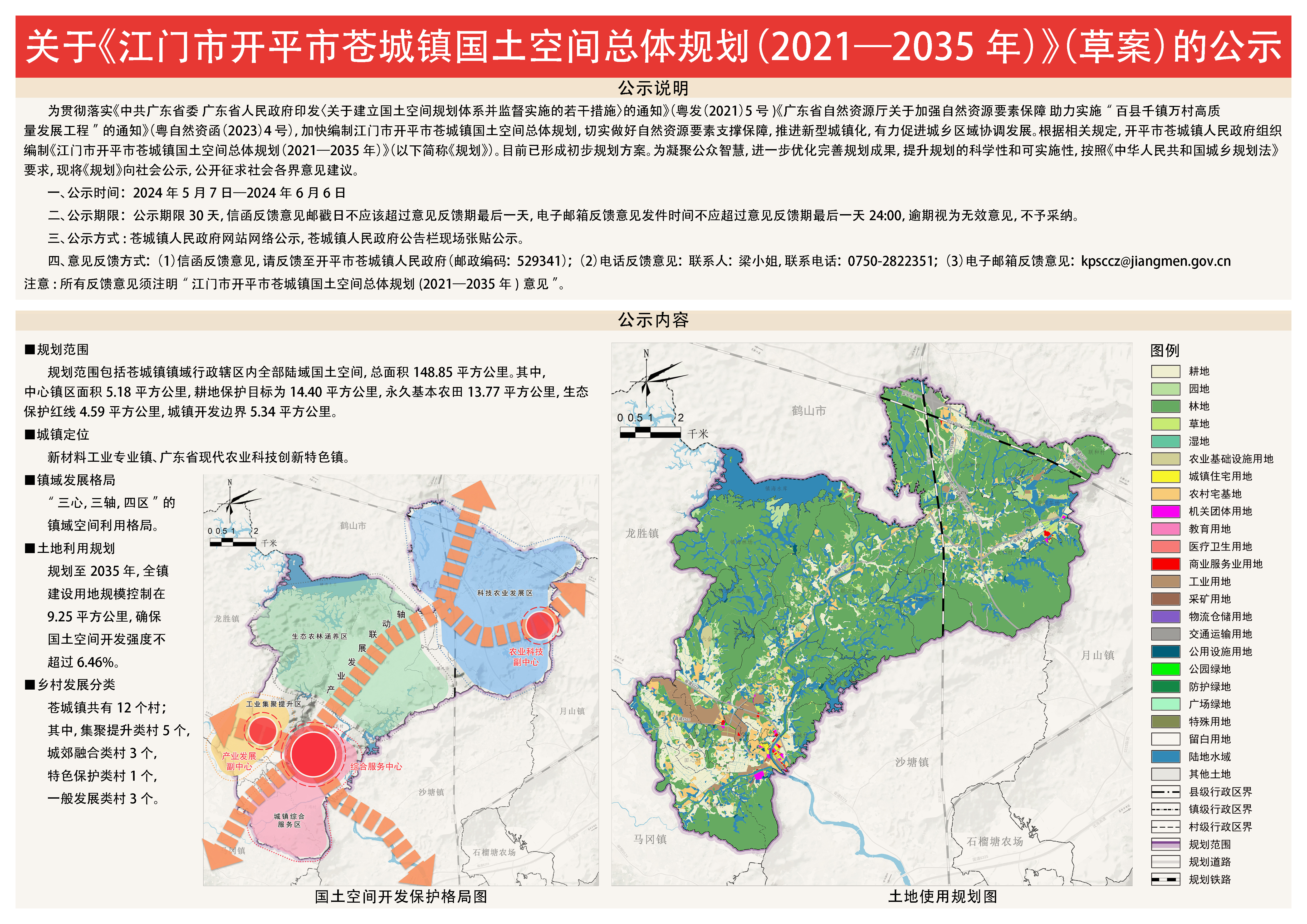 助力實(shí)施“百縣千鎮(zhèn)萬村高質(zhì)量發(fā)展工程”的通知》(粵自然資函(2023)4號),加快編制江門市開平市蒼城鎮(zhèn)國土空間總體規(guī)劃,切實(shí)做好自然資源要素支撐保障,推進(jìn)新型城鎮(zhèn)化,有力促進(jìn)城鄉(xiāng)區(qū)域協(xié)調(diào)發(fā)展。根據(jù)相關(guān)規(guī)定,開平市蒼城鎮(zhèn)人民政府組織編制《江門市開平市蒼城鎮(zhèn)國土空間總體規(guī)劃(2021—2035年)》(以下簡稱《規(guī)劃》)。目前已形成初步規(guī)劃方案。為凝聚公眾智慧,進(jìn)一步優(yōu)化完善規(guī)劃成果,提升規(guī)劃的科學(xué)性和可實(shí)施性,按照《中華人民共和國城鄉(xiāng)規(guī)劃法》要求,現(xiàn)將《規(guī)劃》向社會公示,公開征求社會各界意見建議: 公示時(shí)間:2024年5月7日至2024年6月6日