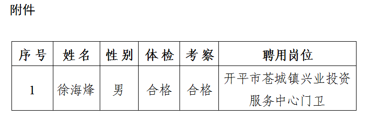 根據(jù)有關(guān)招聘公告,經(jīng)面試、體檢、考察等環(huán)節(jié),現(xiàn)對(duì)擬聘用人員予以公示(公示名單詳見附件)。 公示時(shí)間為2025年9月27日至2025年9月29日止。公示期間,如對(duì)擬聘用人員有異議的,可通過來訪、來電、來信等方式向我單位反映(受理地點(diǎn):開平市蒼城鎮(zhèn)西門街38號(hào),郵編:529341,電話:0750-2828136)。反映情況和問題必須實(shí)事求是,反映人須提供真實(shí)姓名、聯(lián)系電話等以示負(fù)責(zé)。 我單位將對(duì)反映人信息嚴(yán)格保密,按規(guī)定對(duì)所反映的情況和問題認(rèn)真調(diào)查處理,并視情況以適當(dāng)方式向反映人反饋。經(jīng)調(diào)查反映問題影響聘用的,將取消擬聘用人員的聘用資格。 公示期滿無異議或不影響聘用的,按規(guī)定辦理聘用手續(xù)。 開平市蒼城鎮(zhèn)興業(yè)投資服務(wù)中心 2025年9月26日