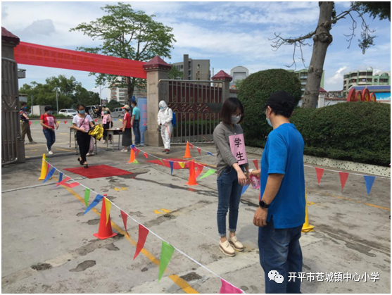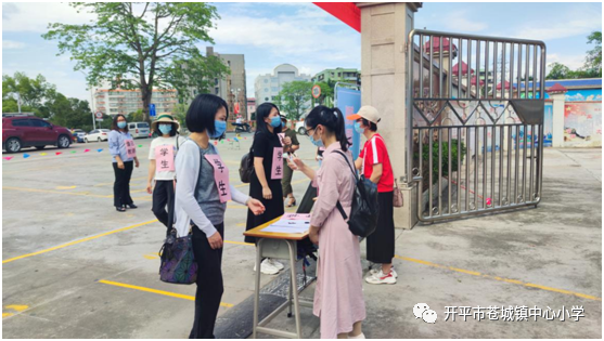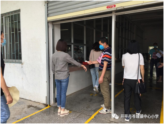 值日老師組織回校“學(xué)生”隔1.5米有序列隊(duì)準(zhǔn)備入校園