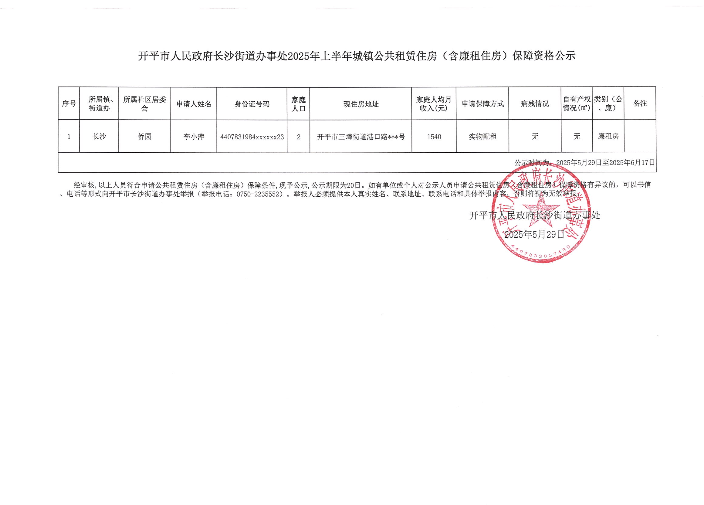 開平市人民政府長(zhǎng)沙街道辦事處2025年上半年城鎮(zhèn)公共租賃住房(含廉租住房)保障資格公示