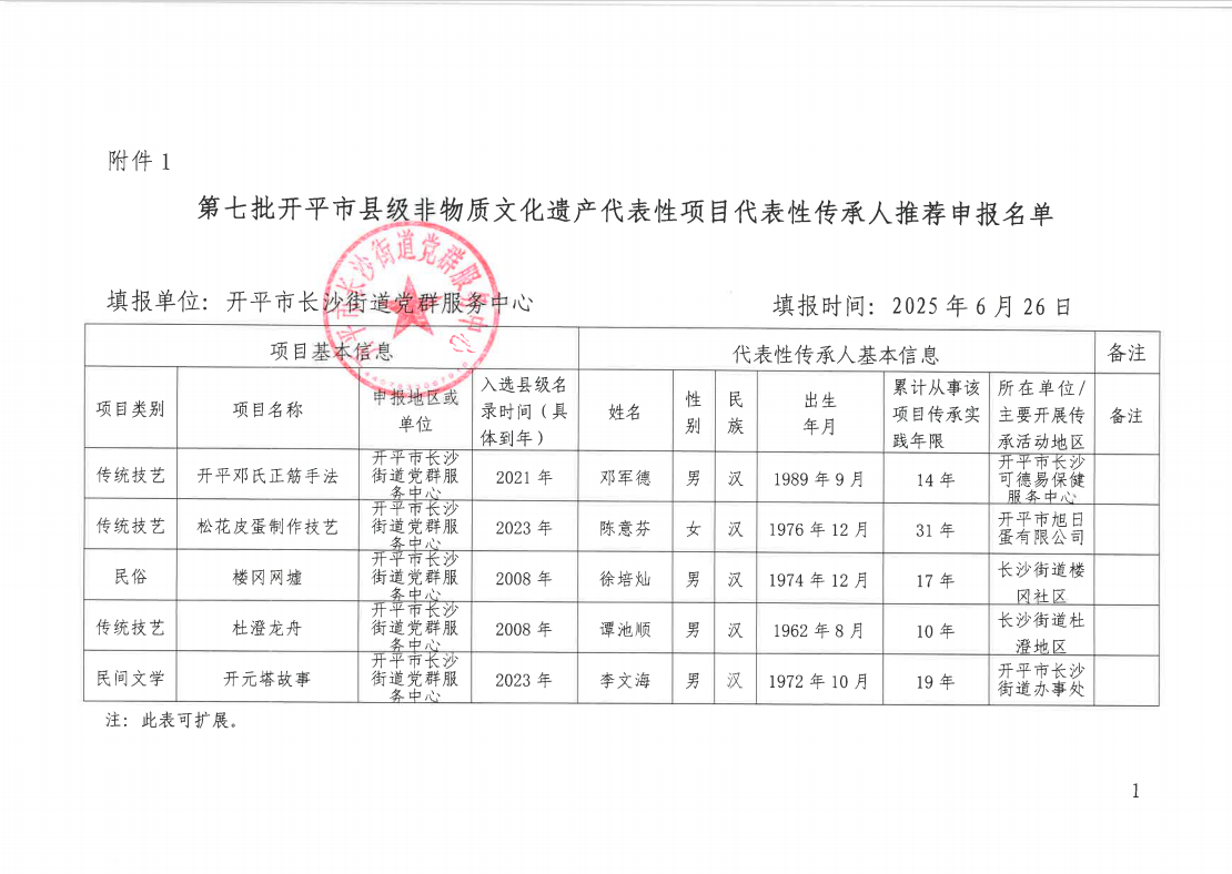 根據(jù)《中華人民共和國非物質(zhì)文化遺產(chǎn)法》和《廣東省非物質(zhì)文化遺產(chǎn)條例》的規(guī)定,現(xiàn)將長沙街道推薦第七批開平市縣級非物質(zhì)文化遺產(chǎn)代表性項目代表性傳承人名單進行公示,公示期十天: