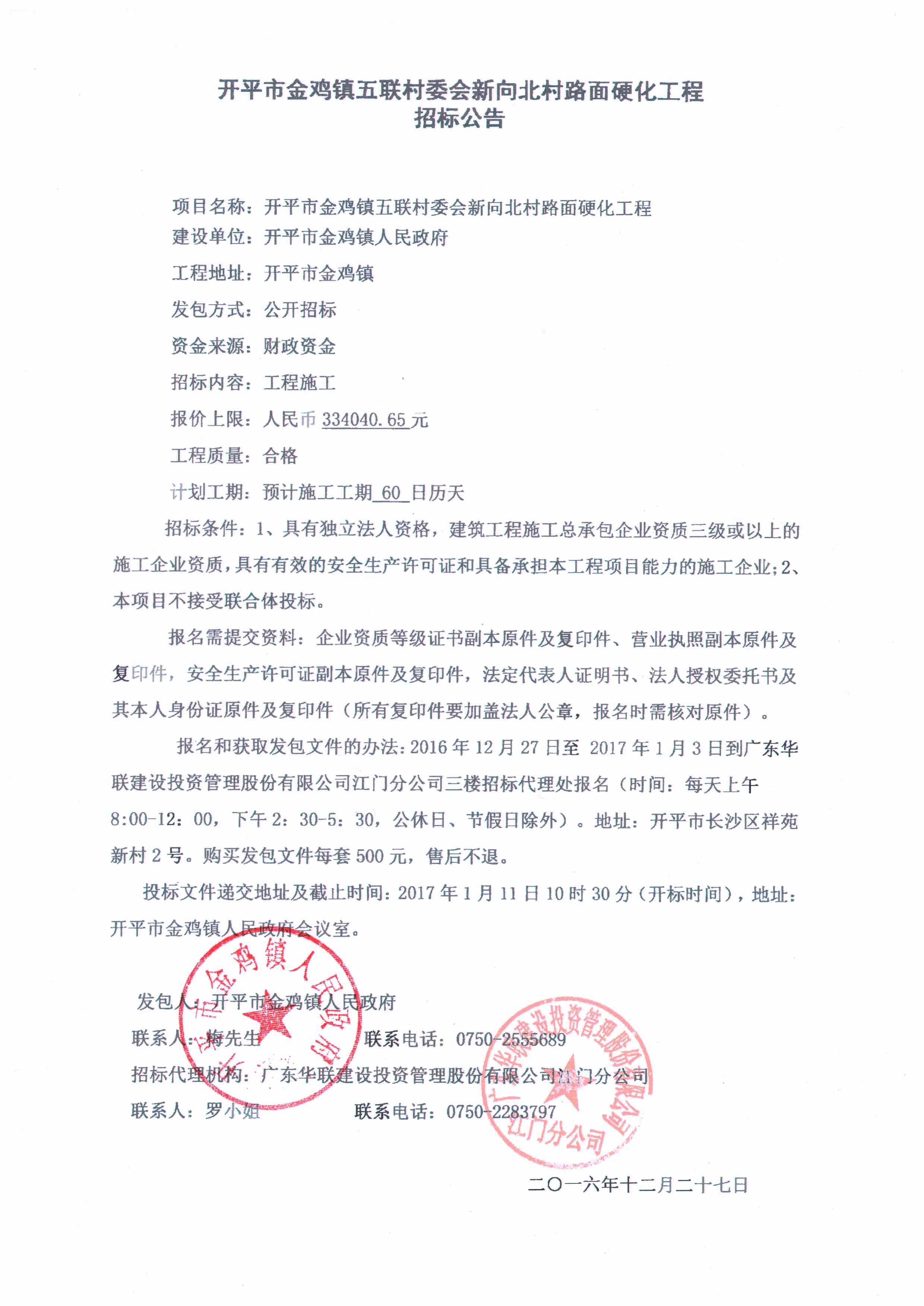 開平市金雞鎮(zhèn)五聯村委會新向北村路面硬化工程招標公告