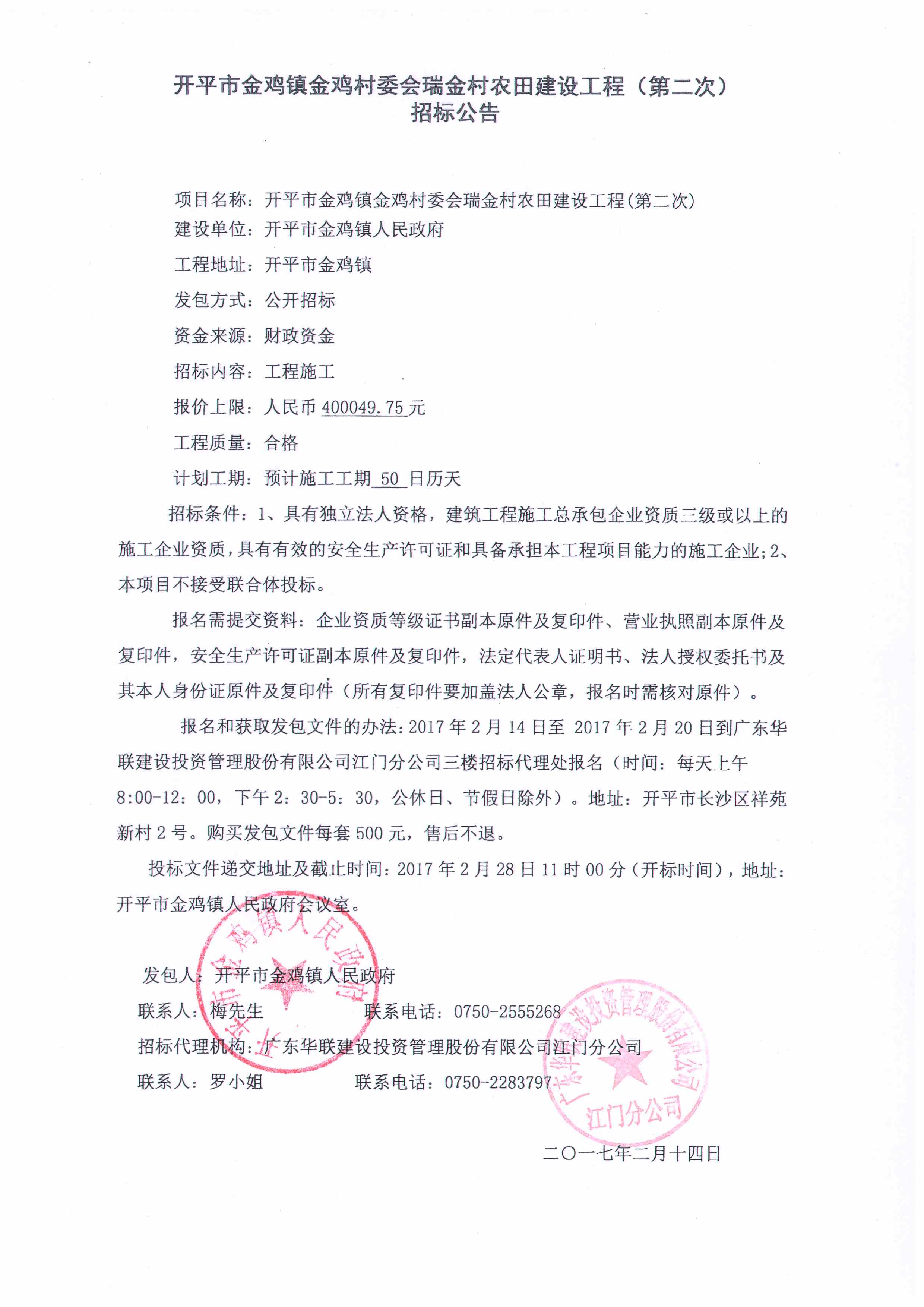 開平市金雞鎮(zhèn)金雞村委會瑞金村農(nóng)田建設(shè)工程招標(biāo)公告(第二次)