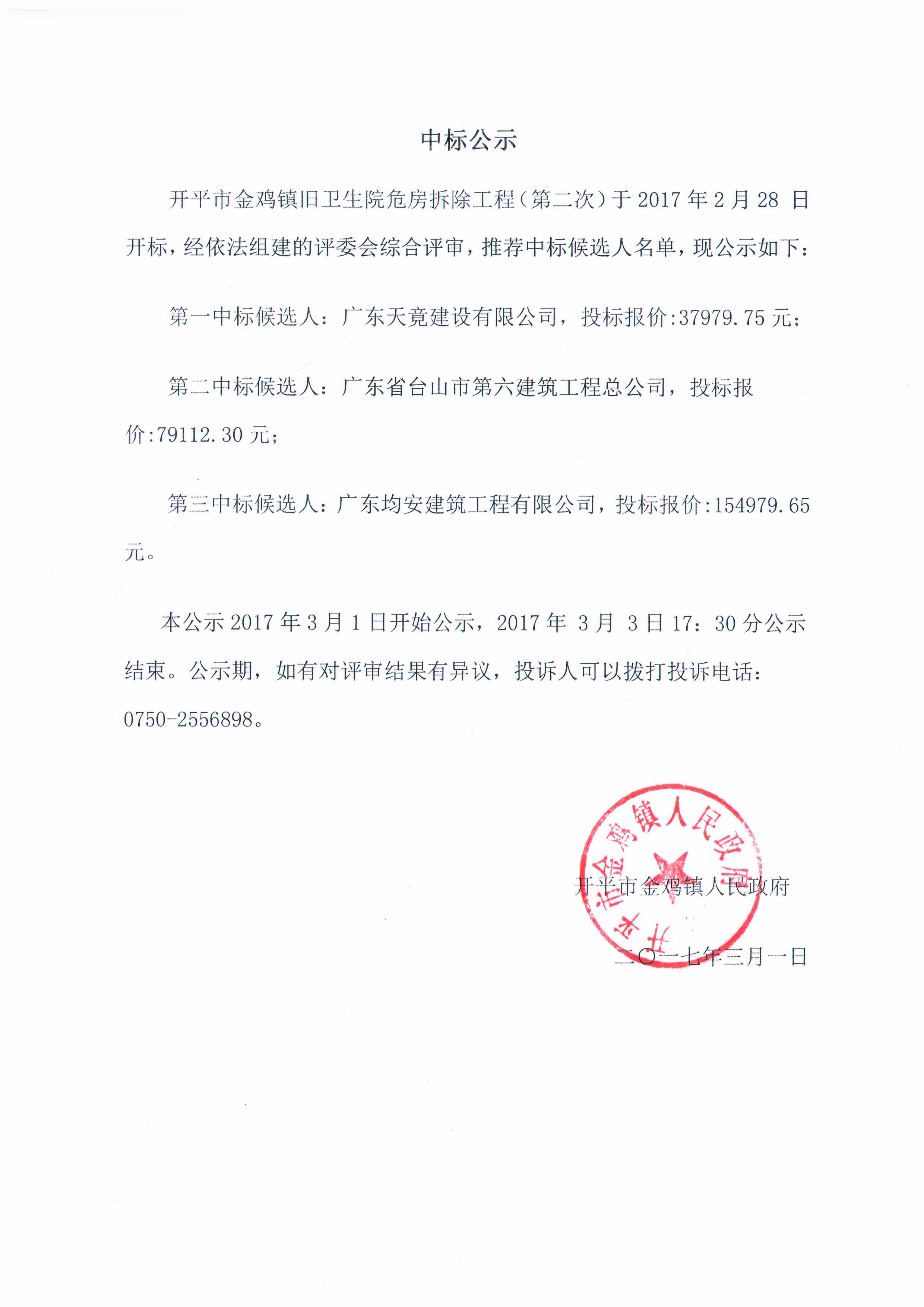 開平市金雞鎮(zhèn)舊衛(wèi)生院危房拆除工程中標公示
