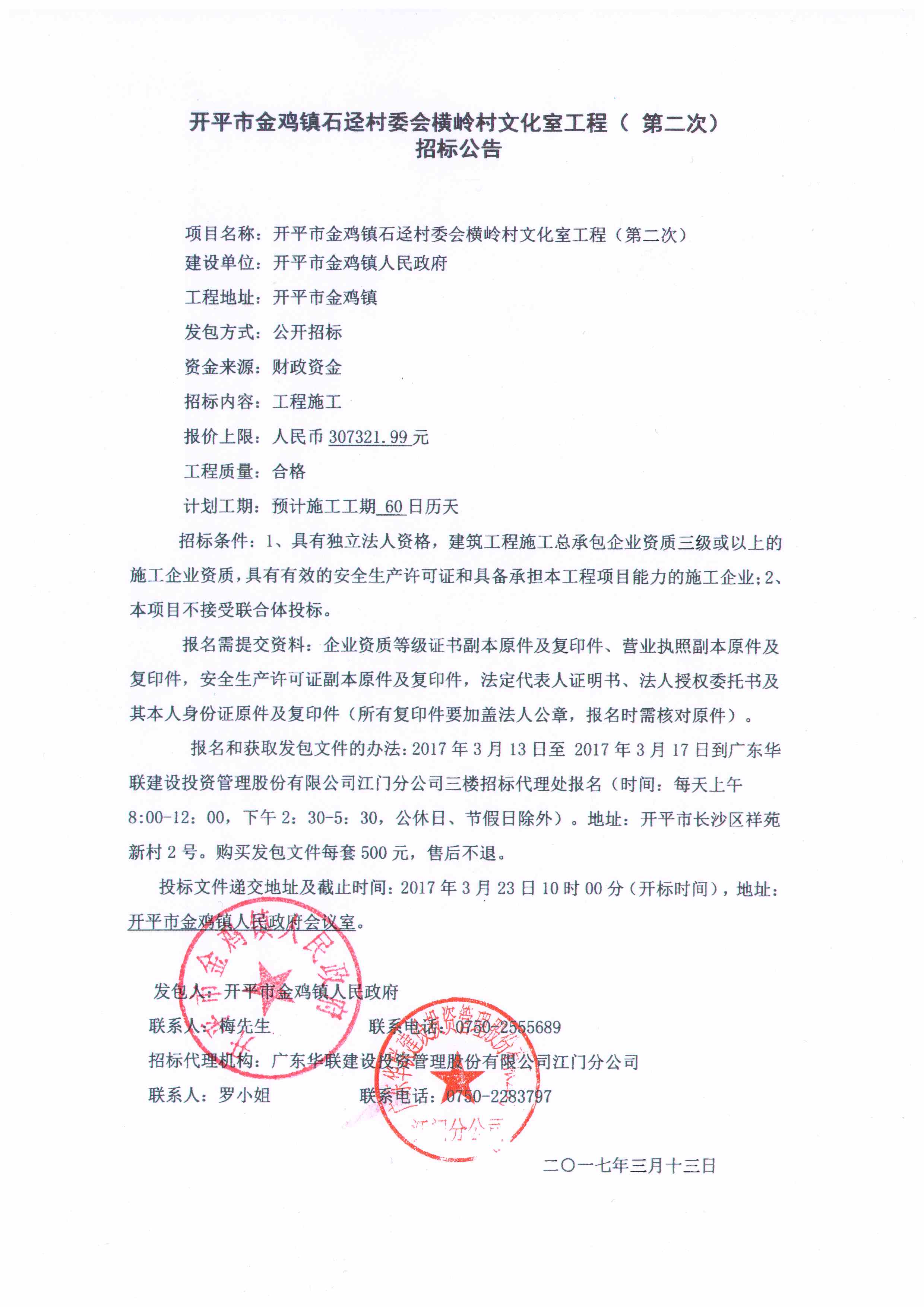 開平市金雞鎮(zhèn)石逕村委會橫嶺村文化室工程(第二次)