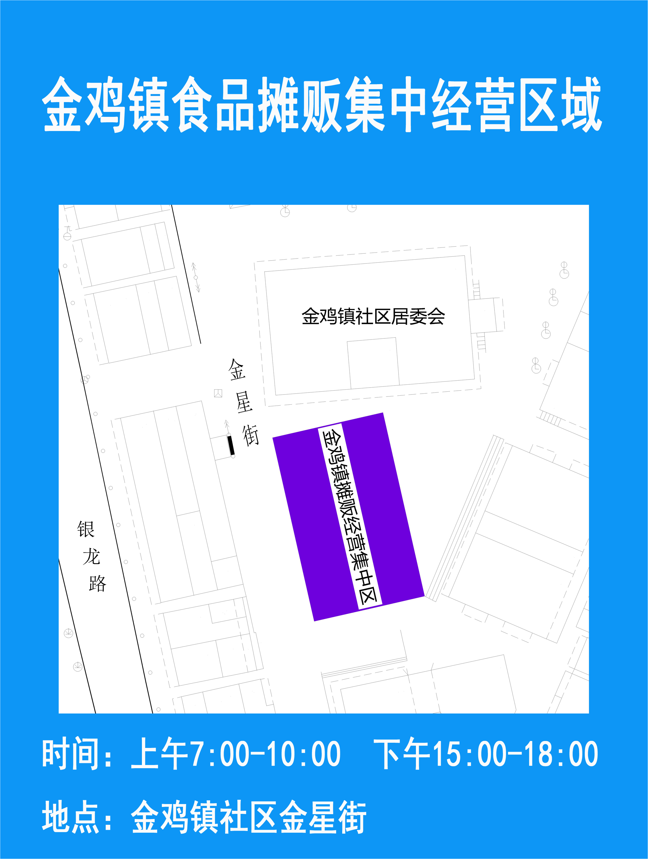 為進(jìn)一步規(guī)范我鎮(zhèn)食品攤販管理,全面提升食品安全監(jiān)管水平,根據(jù)《廣東省食品小作坊和食品攤販管理?xiàng)l例》和《關(guān)于進(jìn)一步落實(shí)鎮(zhèn)(街)職責(zé)加強(qiáng)食品攤販監(jiān)督管理工作的通知》(江食辦[2017]40號)的文件精神及有關(guān)規(guī)定,經(jīng)鎮(zhèn)委鎮(zhèn)政府研究決定,設(shè)立金雞鎮(zhèn)食品攤販集中經(jīng)營區(qū),位置位于金星街社區(qū)居委會正對面,劃定攤位號1-10號為食品攤販集中經(jīng)營區(qū),經(jīng)營時(shí)段:每天上午:7:00至10:00;下午:15:00至18:00,現(xiàn)給予公示。