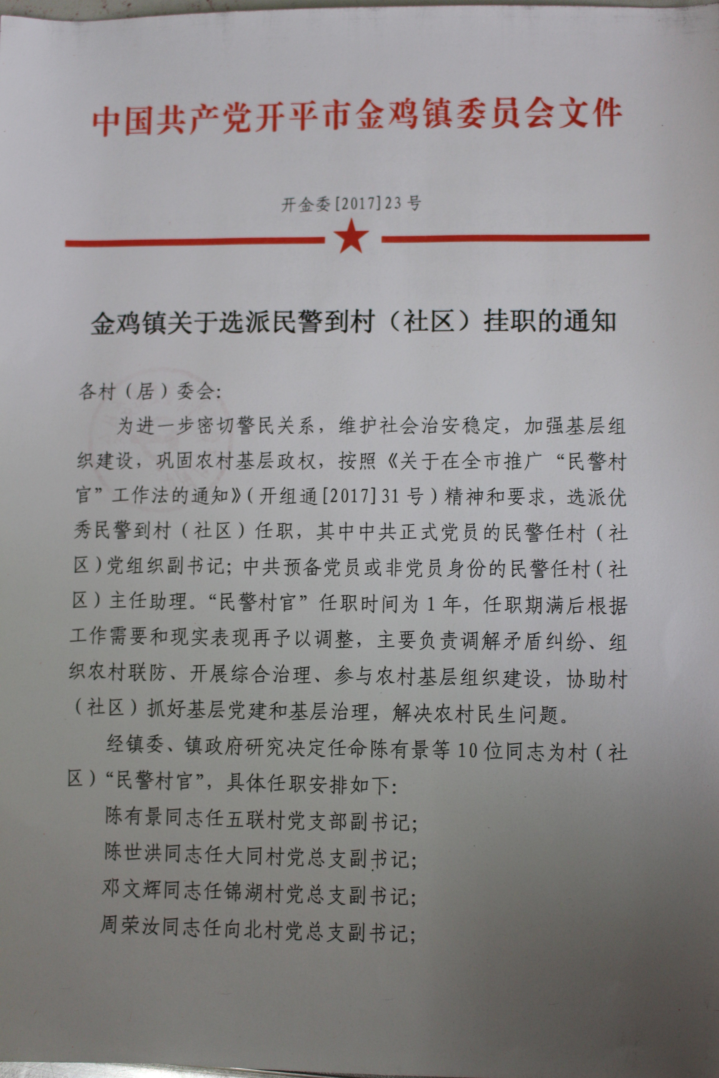 [人事任免]金雞鎮(zhèn)關(guān)于選派民警到村(社區(qū))掛職的通知