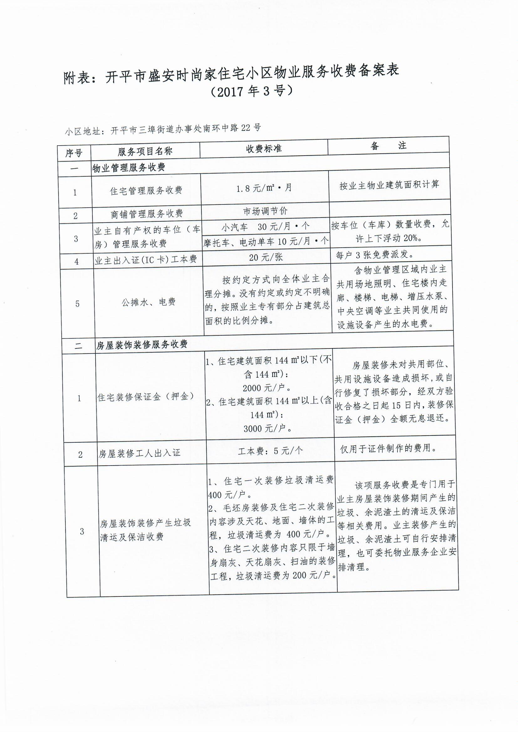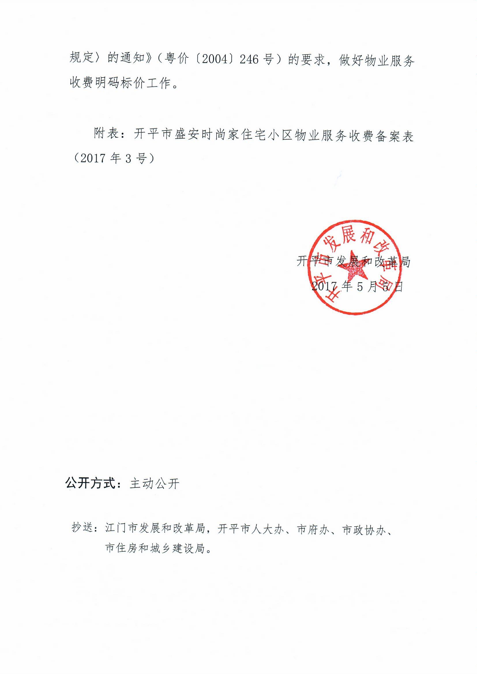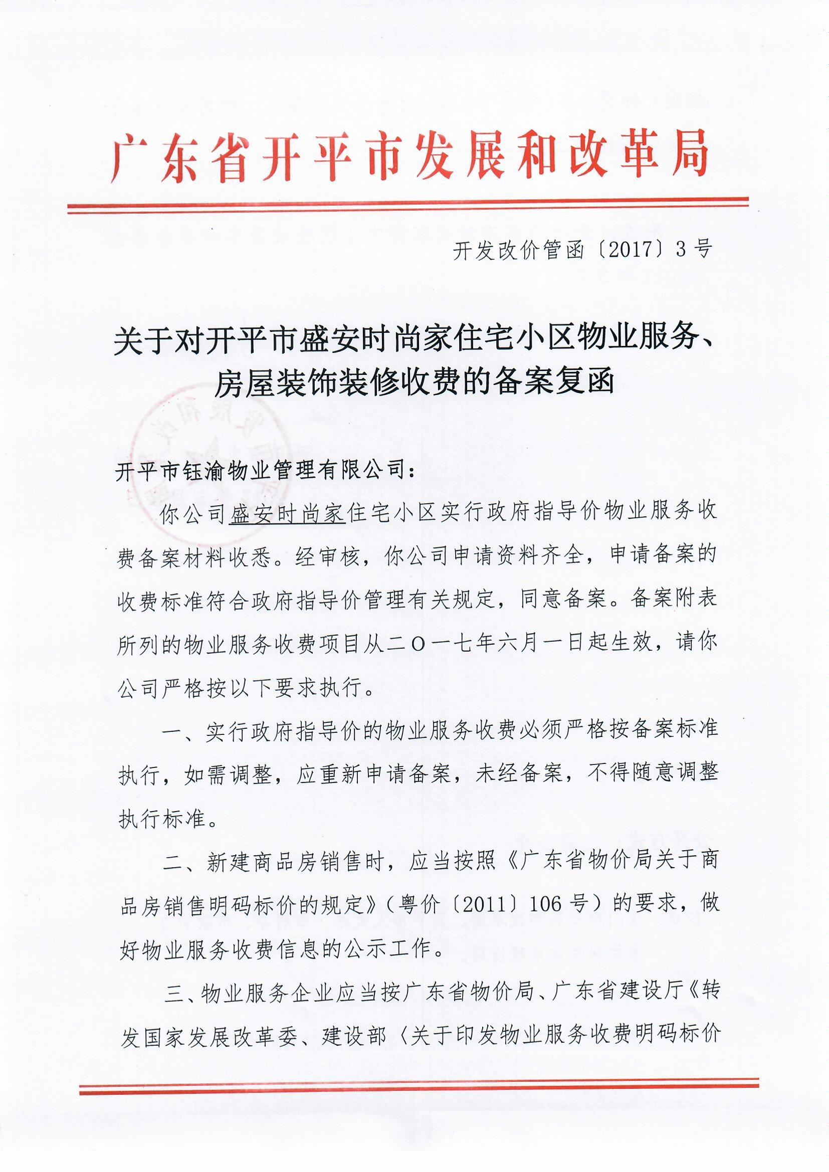 開(kāi)發(fā)改價(jià)管函〔2017〕3號(hào) 關(guān)于對(duì)開(kāi)平市盛安時(shí)尚家住宅小區(qū)物業(yè)服務(wù)、房屋裝飾裝修收費(fèi)的備案復(fù)函
