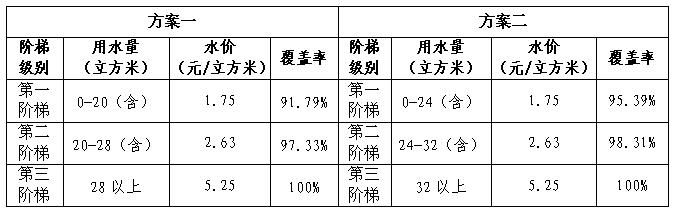 居民用水戶以戶為單位,每戶4人(含4人以下)為基數(shù),第一級(jí)水價(jià)維持現(xiàn)行水價(jià)標(biāo)準(zhǔn)不變,即1.75元/立方米,第二、三級(jí)水價(jià)按照1:1.5:3的比例分別定為2.63元/立方米和5.25元/立方米,制定如下聽證方案: