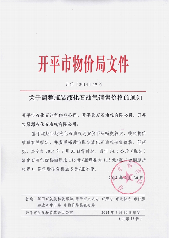 開價[2014]49號 關(guān)于調(diào)整瓶裝液化石油氣銷售價格的通知