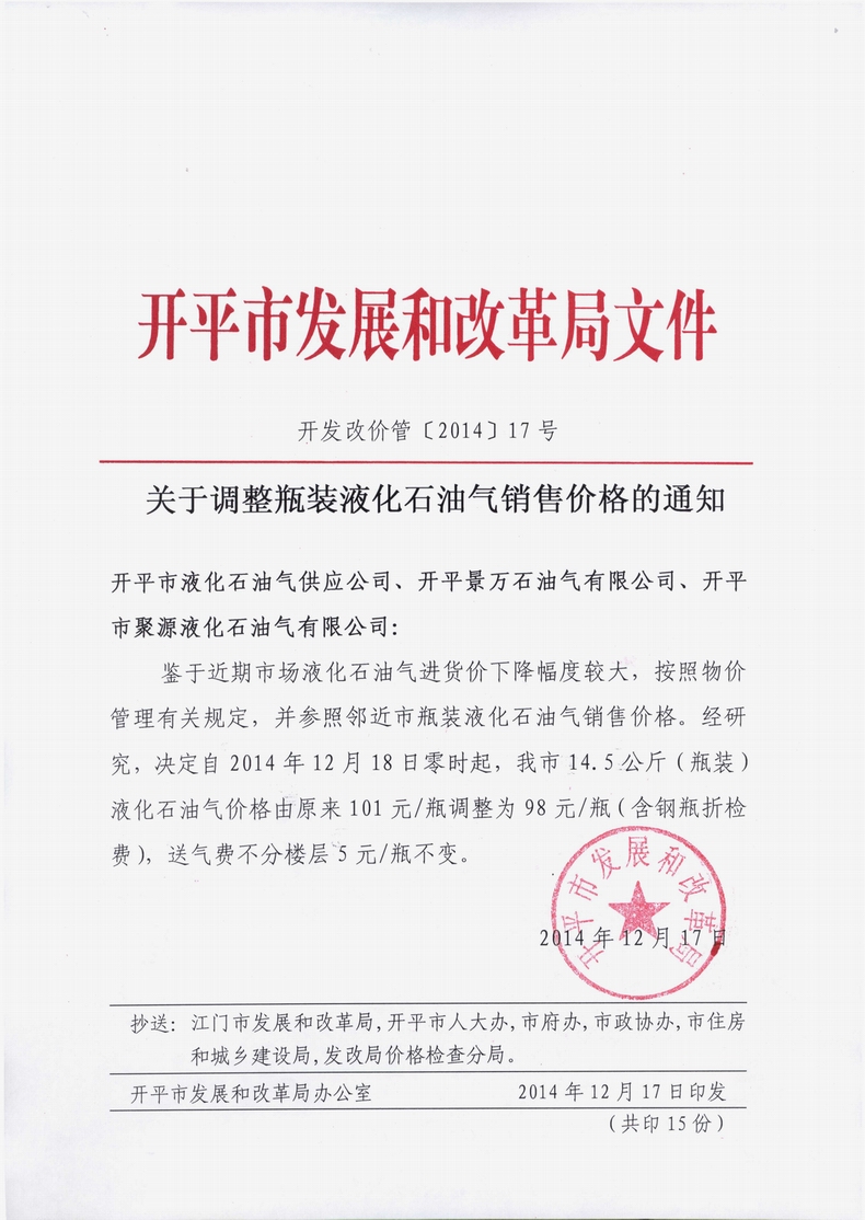 開發(fā)改價管[2014]17號 關(guān)于調(diào)整瓶裝液化石油氣銷售價格的通知