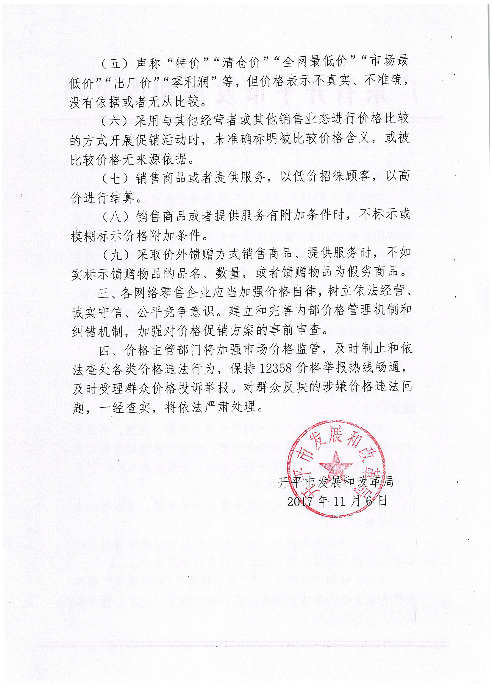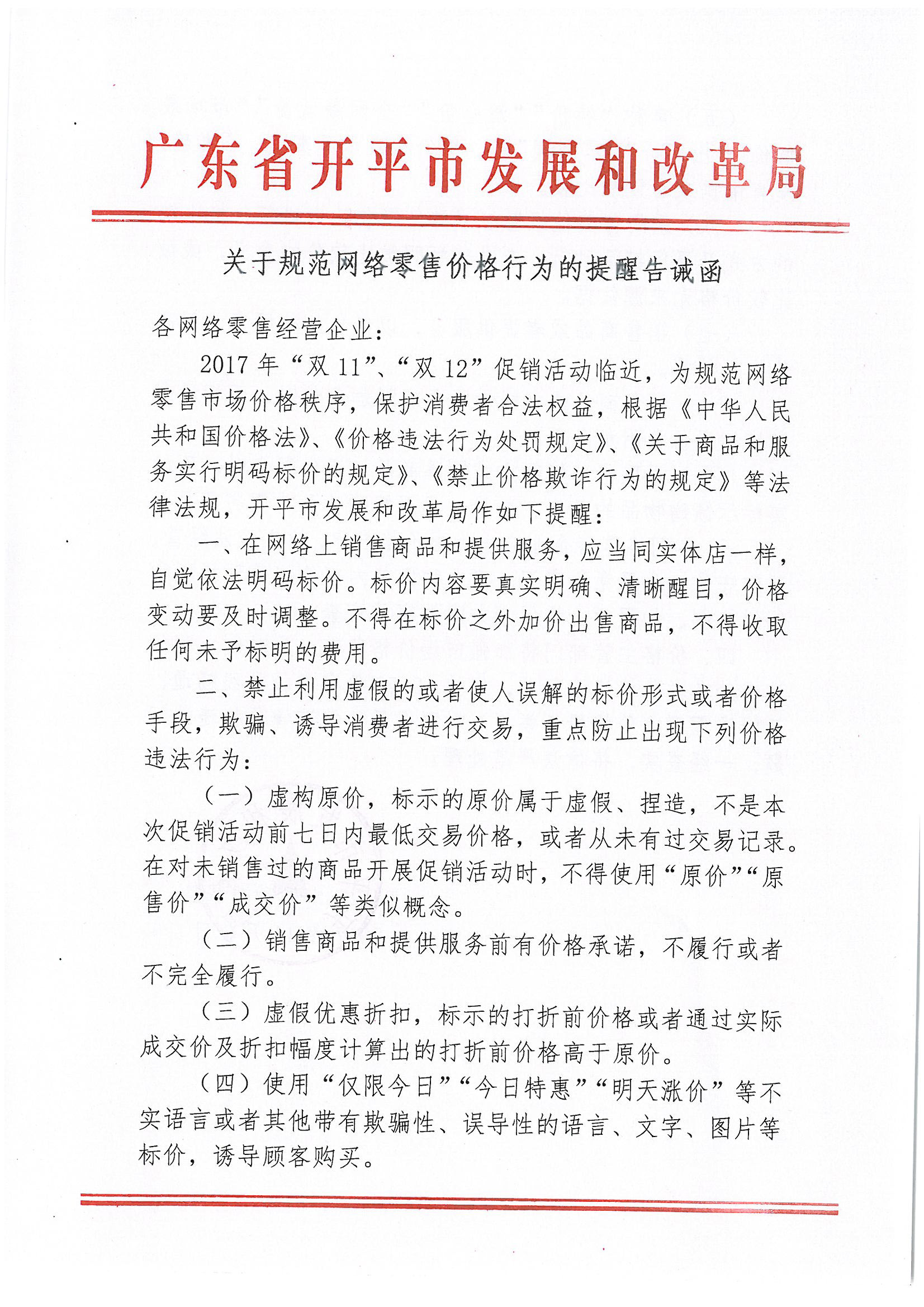 關(guān)于規(guī)范網(wǎng)絡(luò)零售價(jià)格行為的提醒函