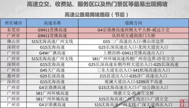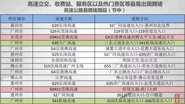 佛山羅格收費站、勒流收費站,廣州三元里收費站、廣園收費站,清遠西收費站。高速公路易堵服務區(qū)中,高峰期擁堵嚴重的是惠州長深高速泰美服務區(qū)、廣州濟廣高速沙埔服務區(qū)、肇慶二廣高速龍甫服務區(qū)、江門沈海高速梁金山服務區(qū)、河源長深高速熱水服務區(qū)、茂名沈海高速電白服務區(qū)。