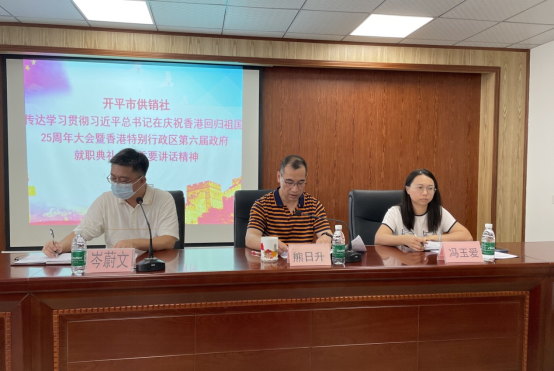 7月20日上午,開(kāi)平市供銷社召開(kāi)黨組(擴(kuò)大)會(huì)議,傳達(dá)學(xué)習(xí)貫徹習(xí)近平總書(shū)記在慶祝香港回歸祖國(guó)25周年大會(huì)暨香港特別行政區(qū)第六屆政府就職典禮上的重要講話精神,以及省、江門、開(kāi)平有關(guān)會(huì)議精神,研究部署我社貫徹落實(shí)意見(jiàn)。市社黨組書(shū)記、主任熊日升主持并講話,市社全體干部職工、下屬單位負(fù)責(zé)人參加了會(huì)議。 會(huì)議指出,習(xí)近平總書(shū)記的重要講話,高度評(píng)價(jià)25年來(lái)“一國(guó)兩制”實(shí)踐在香港取得舉世公認(rèn)的成功,全面總結(jié)“一國(guó)兩制”在香港的豐富實(shí)踐給我們留下的寶貴經(jīng)驗(yàn)、深刻啟示,對(duì)香港特別行政區(qū)新一屆政府和社會(huì)各界人士提出4點(diǎn)希望,蘊(yùn)含著對(duì)香港發(fā)展的深邃思考、體現(xiàn)著對(duì)香港同胞的深切關(guān)懷,為香港開(kāi)創(chuàng)新局面、實(shí)現(xiàn)新飛躍指明了努力方向,注入了堅(jiān)定信心和強(qiáng)大力量,對(duì)供銷工作具有重要指導(dǎo)意義。 會(huì)議強(qiáng)調(diào),要迅速行動(dòng)、精心組織、周密安排,做好宣傳學(xué)習(xí),推動(dòng)習(xí)近平總書(shū)記重要講話精神在我社落地生根、開(kāi)花結(jié)果,切實(shí)把學(xué)習(xí)成果轉(zhuǎn)化為真抓實(shí)干的具體行動(dòng)。一要提高政治站位,切實(shí)把思想和行動(dòng)統(tǒng)一到總書(shū)記、黨中央的決策部署上來(lái)。深刻領(lǐng)會(huì)總書(shū)記重要講話精神,抓住粵港澳大灣區(qū)建設(shè)等重大歷史機(jī)遇,胸懷“國(guó)之大者”,堅(jiān)定捍衛(wèi)“兩個(gè)確立”、堅(jiān)決做到“兩個(gè)維護(hù)”,扎實(shí)抓好疫情防控、供銷綜合改革、服務(wù)“三農(nóng)”的各項(xiàng)工作,以優(yōu)異成績(jī)迎接黨的二十大勝利召開(kāi)。二要從嚴(yán)從緊,科學(xué)精準(zhǔn)做好疫情防控工作。堅(jiān)持“外防輸入、內(nèi)防反彈”總策略和“動(dòng)態(tài)清零”總方針,堅(jiān)決防止麻痹思想、厭戰(zhàn)情緒、松勁心態(tài),鞏固好來(lái)之不易的防控成果。按照我市疫情防控的工作部署,強(qiáng)化疫情防控常態(tài)化管理工作,加強(qiáng)對(duì)辦公場(chǎng)所防疫管理,守好自己的門、管好自己的人,不斷提升科學(xué)防控、精準(zhǔn)防控水平。加大宣傳力度,營(yíng)造防控良好社會(huì)氛圍。強(qiáng)化全局意識(shí)、展示供銷責(zé)任擔(dān)當(dāng),全力以赴保障人民群眾生命安全和身體健康。三要搶抓機(jī)遇,深化與港澳地區(qū)合作交流。緊緊抓住灣區(qū)發(fā)展這一機(jī)遇,圍繞開(kāi)平農(nóng)產(chǎn)品資源及農(nóng)業(yè)產(chǎn)業(yè)發(fā)展優(yōu)勢(shì),積極爭(zhēng)取各方力量支持,加快推進(jìn)與省供銷集團(tuán)公司共建粵港澳大灣區(qū)(江門開(kāi)平)優(yōu)質(zhì)農(nóng)產(chǎn)品供應(yīng)及出口基地建設(shè),為我市乃至珠江西岸的農(nóng)產(chǎn)品輸出提供了強(qiáng)有力的平臺(tái)支撐。四要毫不松懈,嚴(yán)密防范化解各類風(fēng)險(xiǎn)隱患。始終以“時(shí)時(shí)放心不下”的責(zé)任感,抓實(shí)抓細(xì)安全生產(chǎn)各項(xiàng)工作,全力確保人民群眾生命財(cái)產(chǎn)安全。扎實(shí)做好供銷系統(tǒng)意識(shí)形態(tài)領(lǐng)域各項(xiàng)工作,堅(jiān)決守好意識(shí)形態(tài)陣地,嚴(yán)格落實(shí)意識(shí)形態(tài)工作責(zé)任制,筑牢意識(shí)形態(tài)安全“護(hù)城河”和“防火墻”。