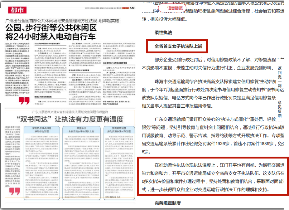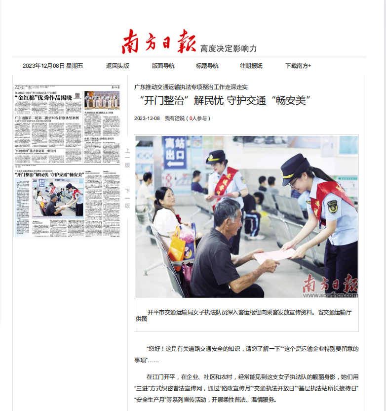 近日,開平市交通運輸局女子執(zhí)法隊積極探索柔性執(zhí)法新路子,不斷提升執(zhí)法服務(wù)新效能,切實推動交通運輸執(zhí)法專項整治工作走深走實,相關(guān)做法獲《南方日報》《南方都市報》等省級媒體報道,引起廣泛關(guān)注。