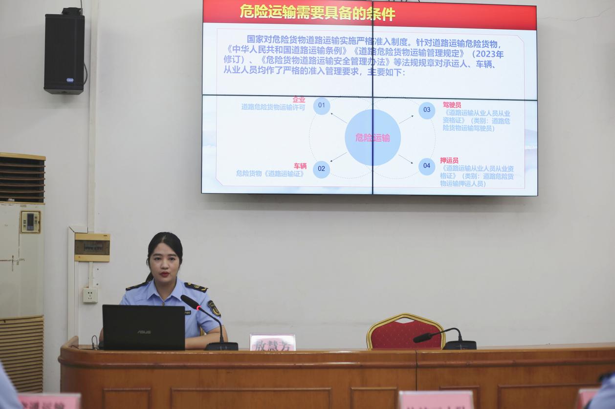 市交通運(yùn)輸局女子執(zhí)法隊(duì)強(qiáng)化安全教育培訓(xùn),聯(lián)合交通運(yùn)輸服務(wù)中心、執(zhí)法一大隊(duì)、執(zhí)法三大隊(duì)對(duì)24家普貨及危貨企業(yè)的負(fù)責(zé)人、從業(yè)人員開展線下專題培訓(xùn)。根據(jù)危化品運(yùn)輸?shù)奶厥庑?,圍繞?;芬婪ㄟ\(yùn)輸裝載、交通事故預(yù)防、應(yīng)急處置措施落實(shí)等方面進(jìn)行了安全宣傳,要求駕駛員、從業(yè)人員嚴(yán)格遵守道路交通安全法律法規(guī),認(rèn)真學(xué)習(xí)危化品運(yùn)輸安全知識(shí),深刻認(rèn)識(shí)到非法運(yùn)輸危險(xiǎn)貨物帶來的嚴(yán)重后果,切實(shí)履行安全管理職責(zé),著力提高應(yīng)急處置能力,確保道路交通安全有序。