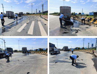 面對這一突發(fā)情況,交通執(zhí)法人員分兩隊(duì)迅速開展行動。部分執(zhí)法人員上前幫助車主將灑落的鯰魚撿起,盡可能減少車主的損失;其他執(zhí)法人員迅速對現(xiàn)場交通進(jìn)行疏導(dǎo),設(shè)置警示標(biāo)志,指揮過往車輛有序通行。在交通執(zhí)法人員與車主共同努力下,路面上的鯰魚被清理干凈,交通恢復(fù)順暢。