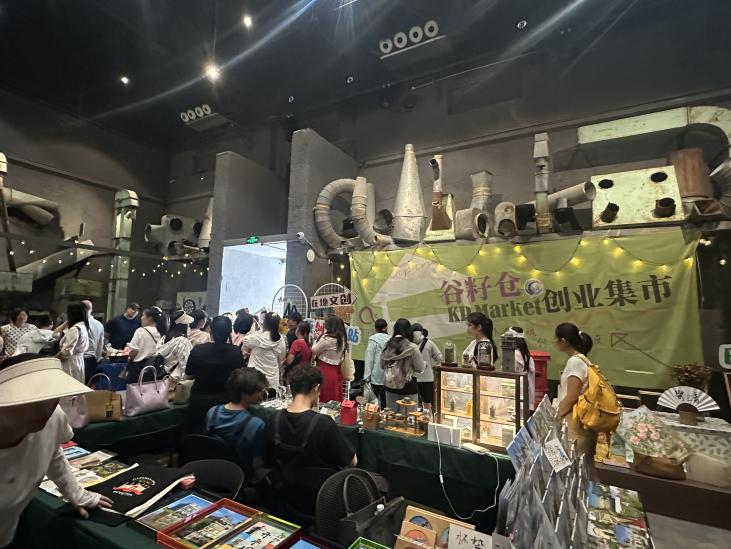 同日,“谷籽倉”-KP.Market創(chuàng)業(yè)集市、2025新品發(fā)布會和“文創(chuàng)應用多元化”主題圓桌會議相繼舉辦。在塘口鎮(zhèn)糧語藝術公社1號倉內,“谷籽倉”-KP.Market創(chuàng)業(yè)集市多個創(chuàng)意十足的創(chuàng)業(yè)攤位吸引了眾多游客駐足參觀、選購。本次集市作為基地的創(chuàng)業(yè)社區(qū)共創(chuàng)共建的“新試驗”,首次將集市與鄉(xiāng)村工業(yè)遺產結合,把集市帶進舊廠房。而2025新品發(fā)布會連續(xù)2年作為基地為返鄉(xiāng)創(chuàng)業(yè)者打造的宣傳推廣平臺,為11名創(chuàng)業(yè)者接近20個最新產品提供了展示的渠道。主題圓桌會議則在基地中廳由創(chuàng)業(yè)導師和創(chuàng)業(yè)者近40人共同探討了“文創(chuàng)應用多元化”的主題,圍繞真實案例,深入剖析了文創(chuàng)產品的多元消費場景,不僅限于旅游紀念品,更可以融入到日常生活和文化消費領域。