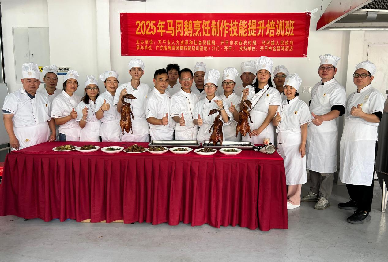 2025年5月,開平市人社局聯(lián)合開平市農(nóng)業(yè)農(nóng)村局、馬岡鎮(zhèn)人民政府縱深啟動馬岡鵝烹飪技藝專項培訓,40余名學員在名廚師傅引領(lǐng)下精研脆皮水秘制工藝與“一鵝多味”味型創(chuàng)新,深入理解并融合經(jīng)典與當代的味覺精髓。2021至今,開平市人社局以粵菜技藝傳承為軸心,依托技能大師工作室及企業(yè)實訓基地,整合社會資源創(chuàng)新培養(yǎng)模式,累計培養(yǎng)持證粵菜師傅超1000人,不僅為本地餐飲業(yè)持續(xù)輸送專業(yè)人才,有效促進就業(yè),更向港澳地區(qū)輸送優(yōu)質(zhì)粵菜師傅,構(gòu)建并完善“本土深耕、灣區(qū)聯(lián)動”的就業(yè)新生態(tài)。