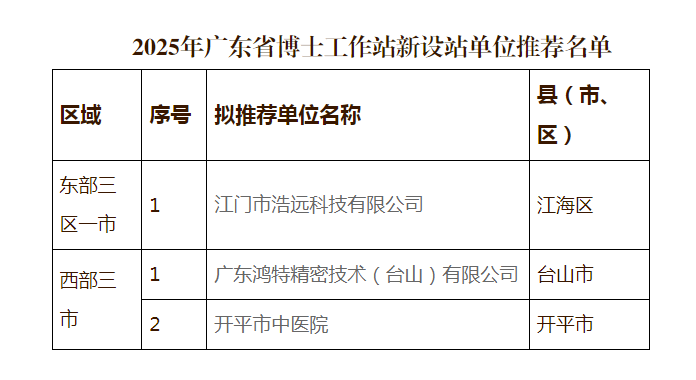 根據(jù)廣東省人力資源和社會(huì)保障廳《關(guān)于開展2025年廣東省博士工作站新設(shè)站遴選推薦及有關(guān)工作的通知》要求,經(jīng)單位申報(bào)、縣(市、區(qū))人社部門推薦、市人力資源社會(huì)保障局審定,確定江門市2025年擬向省推薦廣東省博士工作站新設(shè)站單位名單,現(xiàn)對(duì)擬推薦單位進(jìn)行公示。