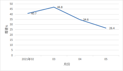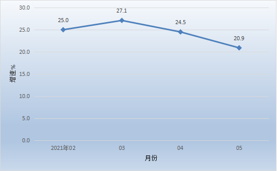 開(kāi)平市1-5月經(jīng)濟(jì)運(yùn)行簡(jiǎn)況 1-5月,全市主要經(jīng)濟(jì)指標(biāo)運(yùn)行簡(jiǎn)況如下: 一、工業(yè)生產(chǎn) 1-5月,開(kāi)平規(guī)模以上工業(yè)企業(yè)累計(jì)完成工業(yè)增加值45.40億元,同比增長(zhǎng)26.4%。 分經(jīng)濟(jì)類型看,股份制企業(yè)增長(zhǎng)35.1%;外商及港澳臺(tái)商投資企業(yè)增長(zhǎng)21.4%;私營(yíng)企業(yè)增長(zhǎng)35.4%。分門類看,采礦業(yè)增加值增長(zhǎng)4.1%,制造業(yè)增加值增長(zhǎng)26.6%,電力、熱力、燃?xì)饧八a(chǎn)和供應(yīng)業(yè)增加值增長(zhǎng)25.7%。1-5月全市工業(yè)用電量增長(zhǎng)31.8%。 圖一:2021年2月以來(lái)我市工業(yè)增加值增速情況 二、投資 1-5月,全市完成固定資產(chǎn)投資同比增長(zhǎng)24.4%。分經(jīng)濟(jì)類型看,國(guó)有投資增長(zhǎng)11.6%;民間投資增長(zhǎng)55.0%。分產(chǎn)業(yè)看,第一產(chǎn)業(yè)投資增長(zhǎng)320.4%;第二產(chǎn)業(yè)投資增長(zhǎng)46.1%,其中工業(yè)投資增長(zhǎng)46.1%;第三產(chǎn)業(yè)投資增長(zhǎng)10.0%,其中房地產(chǎn)投資下降8.0%。 三、消費(fèi)市場(chǎng) 1-5月,我市完成社會(huì)消費(fèi)品零售總額68.70億元,同比增長(zhǎng)20.9%。 圖二:2021年2月以來(lái)我市社會(huì)消費(fèi)品零售總額增速情況 四、財(cái)政收入 1-5月,全市實(shí)現(xiàn)地方一般公共預(yù)算收入12.26億元,同比增長(zhǎng)22.8%,其中稅收收入6.80億元,同比增長(zhǎng)11.8%。 五、金融市場(chǎng) 1-5月,全市金融機(jī)構(gòu)人民幣各項(xiàng)存款余額719.72億元,同比增長(zhǎng)5.7%;人民幣各項(xiàng)貸款余額500.54億元,同比增長(zhǎng)14.6%。