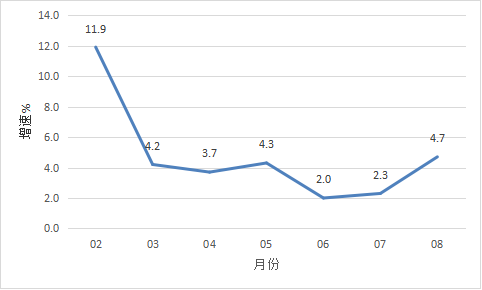 2022年2月以來我市規(guī)模以上工業(yè)增加值情況 二、投資 1-8月,全市完成固定資產(chǎn)投資同比下降14.7%。從分經(jīng)濟類型看,國有投資增長33.1%;民間投資下降11.5%。分產(chǎn)業(yè)看,第一產(chǎn)業(yè)投資下降48.2%;第二產(chǎn)業(yè)投資增長下降0.5%,其中工業(yè)投資下降0.5%;第三產(chǎn)業(yè)投資下降22.3%,其中房地產(chǎn)投資下降31.7%。 三、消費市場 1-8月,我市完成社會消費品零售總額118.17億元,同比增長3.0%。 圖二