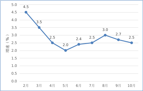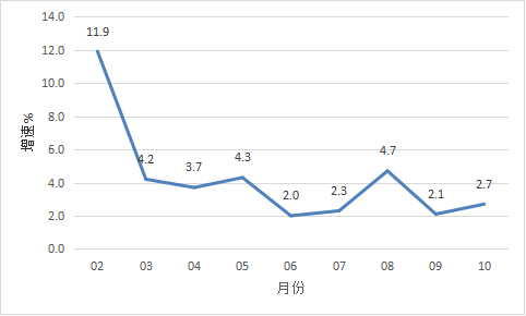 2022年2月以來我市規(guī)模以上工業(yè)增加值情況 二、投資 1-10月,全市完成固定資產(chǎn)投資同比下降13.2%。從分經(jīng)濟類型看,國有投資增長39.2%;民間投資下降19.3%。分產(chǎn)業(yè)看,第一產(chǎn)業(yè)投資下降24.2%;第二產(chǎn)業(yè)投資增長3.3%,其中工業(yè)投資增長3.3%;第三產(chǎn)業(yè)投資下降23.3%,其中房地產(chǎn)投資下降35.6%。 三、消費市場 1-10月,我市完成社會消費品零售總額154.08億元,同比增長2.5%。 圖二
