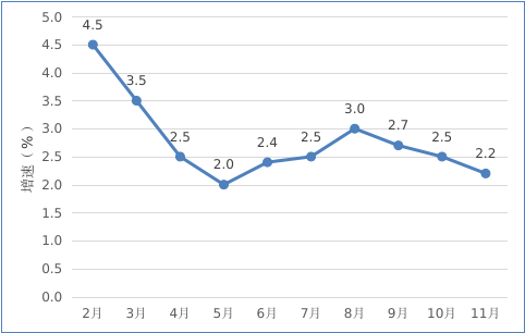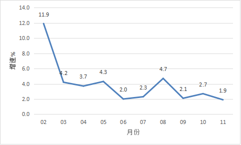 2022年2月以來(lái)我市規(guī)模以上工業(yè)增加值情況 二、投資 1-11月,全市完成固定資產(chǎn)投資同比下降16.1%。從分經(jīng)濟(jì)類型看,國(guó)有投資增長(zhǎng)36.0%;民間投資下降21.8%。分產(chǎn)業(yè)看,第一產(chǎn)業(yè)投資下降34.5%;第二產(chǎn)業(yè)投資增長(zhǎng)5.1%,其中工業(yè)投資增長(zhǎng)5.1%;第三產(chǎn)業(yè)投資下降28.4%,其中房地產(chǎn)投資下降40.2%。 三、消費(fèi)市場(chǎng) 1-11月,我市完成社會(huì)消費(fèi)品零售總額168.75億元,同比增長(zhǎng)2.2%。 圖二