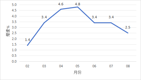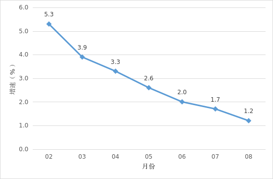 1-8月,全市主要經(jīng)濟(jì)指標(biāo)運(yùn)行簡(jiǎn)況如下: 一、工業(yè)生產(chǎn) 1-8月,開(kāi)平規(guī)模以上工業(yè)企業(yè)累計(jì)完成工業(yè)增加值85.41億元,同比增長(zhǎng)2.5%。 分經(jīng)濟(jì)類(lèi)型看,股份制企業(yè)增長(zhǎng)4.8%;外商及港澳臺(tái)商投資企業(yè)下降1.4%;私營(yíng)企業(yè)下降2.3%。分門(mén)類(lèi)看,采礦業(yè)增加值下降24.1%,制造業(yè)增加值增長(zhǎng)1.2%,電力、熱力、燃?xì)饧八a(chǎn)和供應(yīng)業(yè)增加值增長(zhǎng)105.7%。 圖一 2024年2月以來(lái)開(kāi)平市規(guī)模以上工業(yè)增加值增速 二、投資 1-8月,全市完成固定資產(chǎn)投資同比增長(zhǎng)3.0%。分經(jīng)濟(jì)類(lèi)型看,國(guó)有投資下降20.8%,民間投資下降3.1%。分產(chǎn)業(yè)看,第一產(chǎn)業(yè)投資下降47.5%;第二產(chǎn)業(yè)投資增長(zhǎng)4.8%,其中工業(yè)投資增長(zhǎng)4.8%;第三產(chǎn)業(yè)投資增長(zhǎng)2.2%,其中房地產(chǎn)投資下降13.7%。 三、消費(fèi)市場(chǎng) 1-8月,我市完成社會(huì)消費(fèi)品零售總額121.74億元,同比增長(zhǎng)1.2%。 圖二 2024年2月以來(lái)開(kāi)平市社會(huì)消費(fèi)品零售總額增速 四、財(cái)政收入 1-8月,全市實(shí)現(xiàn)地方一般公共預(yù)算收入17.96億元,同比增長(zhǎng)4.1%,其中稅收收入9.69億元,同比下降7.3%。 五、金融市場(chǎng) 8月末,全市金融機(jī)構(gòu)本外幣各項(xiàng)存款余額955.77億元,同比增長(zhǎng)6.3%;本外幣各項(xiàng)貸款余額699.49億元,同比增長(zhǎng)8.1%。 六、外貿(mào)進(jìn)出口 1-8月,全市外貿(mào)進(jìn)出口總額108.6億元,同比增長(zhǎng)8.7%。其中,進(jìn)口9.9億元,同比增長(zhǎng)21.4%;出口98.7億元,同比增長(zhǎng)7.6%。