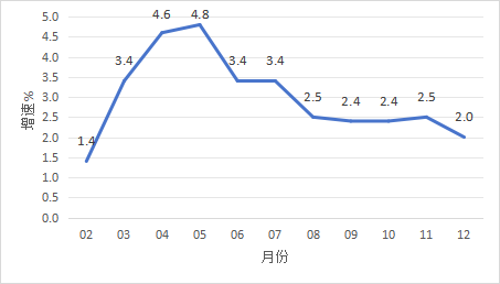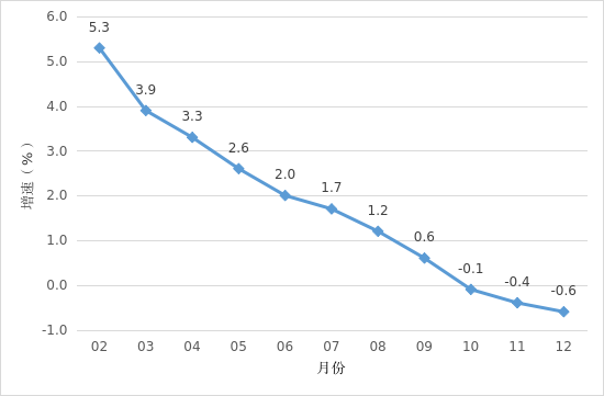 2024年,全市主要經(jīng)濟(jì)指標(biāo)運(yùn)行簡(jiǎn)況如下: 一、地區(qū)生產(chǎn)總值 根據(jù)江門(mén)市地區(qū)生產(chǎn)總值統(tǒng)一核算結(jié)果,2024年,開(kāi)平市實(shí)現(xiàn)地區(qū)生產(chǎn)總值515.47億元,同比增長(zhǎng)2.5%。其中,第一產(chǎn)業(yè)增加值59.07億元,同比增長(zhǎng)4.7%;第二產(chǎn)業(yè)增加值256.34億元,增長(zhǎng)3.9%;第三產(chǎn)業(yè)增加值200.06億元,增長(zhǎng)0.1%。全市三次產(chǎn)業(yè)結(jié)構(gòu)比為11.5∶49.7∶38.8。 二、農(nóng)林牧漁業(yè) 2024年,全市實(shí)現(xiàn)農(nóng)林牧漁業(yè)總產(chǎn)值114.79億元,同比增長(zhǎng)5.4%。其中,農(nóng)業(yè)產(chǎn)值40.96億元,同比增長(zhǎng)4.1%;林業(yè)產(chǎn)值3.26億元,增長(zhǎng)10.0%;牧業(yè)產(chǎn)值47.74億元,增長(zhǎng)6.3%;漁業(yè)產(chǎn)值13.63億元,增長(zhǎng)3.0%;農(nóng)林牧漁專(zhuān)業(yè)及輔助性活動(dòng)產(chǎn)值9.21億元,增長(zhǎng)10.2%。 三、工業(yè)生產(chǎn) 2024年,開(kāi)平規(guī)模以上工業(yè)企業(yè)累計(jì)完成工業(yè)增加值132.04億元,同比增長(zhǎng)2.0%。 分經(jīng)濟(jì)類(lèi)型看,股份制企業(yè)增長(zhǎng)7.4%;外商及港澳臺(tái)商投資企業(yè)下降2.6%;私營(yíng)企業(yè)增長(zhǎng)1.9%。分門(mén)類(lèi)看,采礦業(yè)增加值下降38.4%,制造業(yè)增加值增長(zhǎng)1.1%,電力、熱力、燃?xì)饧八a(chǎn)和供應(yīng)業(yè)增加值增長(zhǎng)68.5%。 2024年全市工業(yè)用電量增長(zhǎng)6.5%。 圖一 2024年2月以來(lái)開(kāi)平市規(guī)模以上工業(yè)增加值增速 四、投資 2024年,全市固定資產(chǎn)完成投資同比增長(zhǎng)0.3%。分三次產(chǎn)業(yè)來(lái)看,第一產(chǎn)業(yè)完成投資同比下降50.2%;第二產(chǎn)業(yè)完成投資同比增長(zhǎng)0.5%;第三產(chǎn)業(yè)完成投資同比增長(zhǎng)2.6%。分三大建設(shè)領(lǐng)域來(lái)看,工業(yè)完成投資同比增長(zhǎng)0.5%;基礎(chǔ)設(shè)施完成投資同比增長(zhǎng)8.3%;房地產(chǎn)完成投資同比下降11.9%。 五、消費(fèi)市場(chǎng) 2024年,我市完成社會(huì)消費(fèi)品零售總額188.45億元,同比下降0.6%。 圖二 2024年2月以來(lái)開(kāi)平市社會(huì)消費(fèi)品零售總額增速 六、財(cái)政收入 2024年,全市實(shí)現(xiàn)地方一般公共預(yù)算收入32.04億元,同比增長(zhǎng)3.2%,其中稅收收入15.70億元,同比下降7.1%。 七、金融市場(chǎng) 12月末,全市金融機(jī)構(gòu)本外幣各項(xiàng)存款余額1033.96億元,同比增長(zhǎng)10.6%;本外幣各項(xiàng)貸款余額724.69億元,同比增長(zhǎng)7.2%。