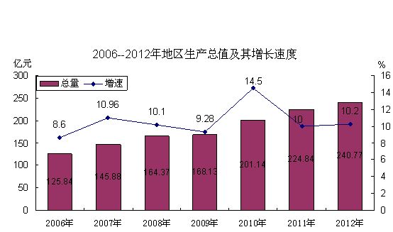 初步核算,2012年全市實(shí)現(xiàn)地區(qū)生產(chǎn)總值240.77億元(當(dāng)年價(jià)),比上年增長(zhǎng)10.2%。其中:第一產(chǎn)業(yè)增加值24.76億元,增長(zhǎng)3.1%;第二產(chǎn)業(yè)增加值123.47億元,增長(zhǎng)8.3 %;第三產(chǎn)業(yè)增加值92.54億元,增長(zhǎng)15.2%。第一、二、三產(chǎn)業(yè)增加值的比重為10.3 :51.3 : 38.4。人均生產(chǎn)總值34362元。