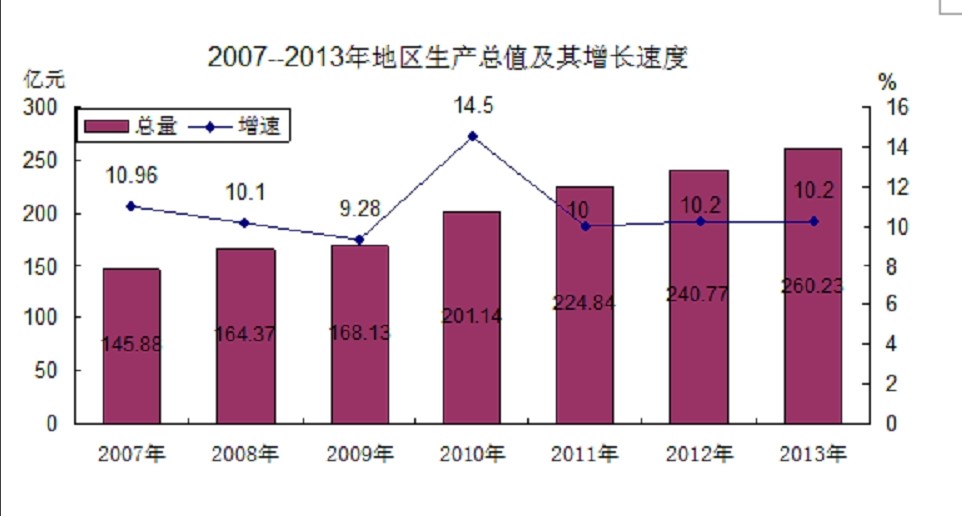初步核算,2013年全市實現(xiàn)地區(qū)生產(chǎn)總值260.23億元(當年價),比上年增長10.2%。其中:第一產(chǎn)業(yè) 增加值25.97億元,增長1.9%;第二產(chǎn)業(yè)增加值131.33億元,增長15.2%;第三產(chǎn)業(yè)增加值102.93億元,增長5.2%。第一、二、三產(chǎn)業(yè)增加值的比重為9.98 :50.47 : 39.55。人均生產(chǎn)總值37039元。