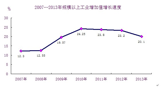 2013年,全市規(guī)模以上工業(yè)企業(yè)233家,規(guī)模以上工業(yè)增加值比上年增長20.1%,工業(yè)總產(chǎn)值比上年增長18.8 %。工業(yè)總產(chǎn)值中,按輕重工分:輕工業(yè)增長26.84%,重工業(yè)增長42.28%;按企業(yè)經(jīng)濟類型分:外商及港澳臺商投資企業(yè)增長32.89 %;國有企業(yè)下降4.75 %;股份制企業(yè)增長33.25 %;其他經(jīng)濟類型增長50.03%。