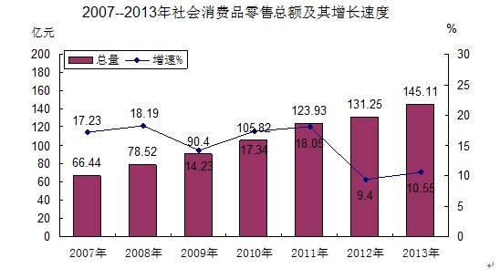 全年社會消費品零售總額145.11億元,比上年增長10.55%。其中:城市消費品零售額101.74億元,比上年增長11.87%;農(nóng)村消費品零售額43.37億元,比上年增長7.58%。