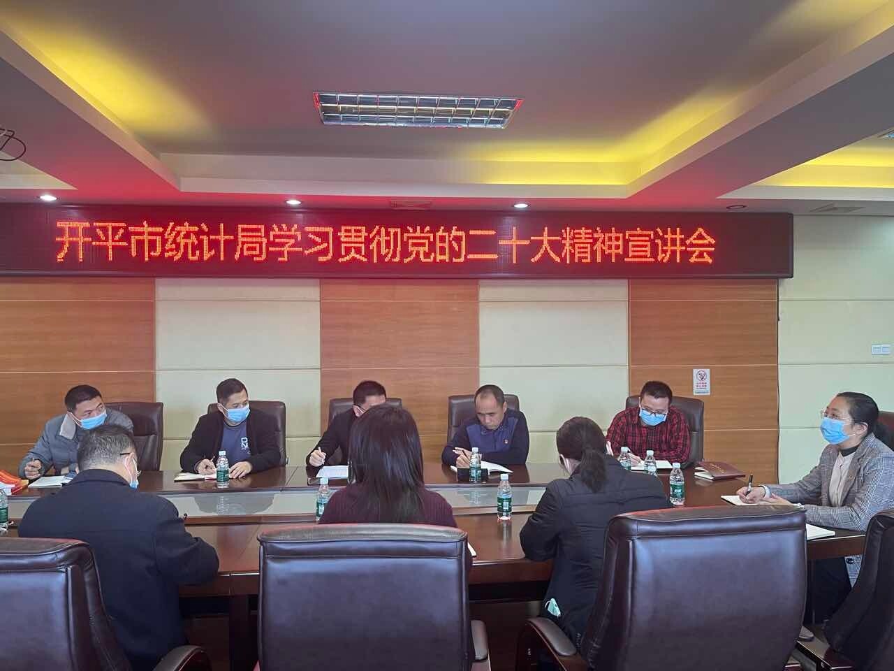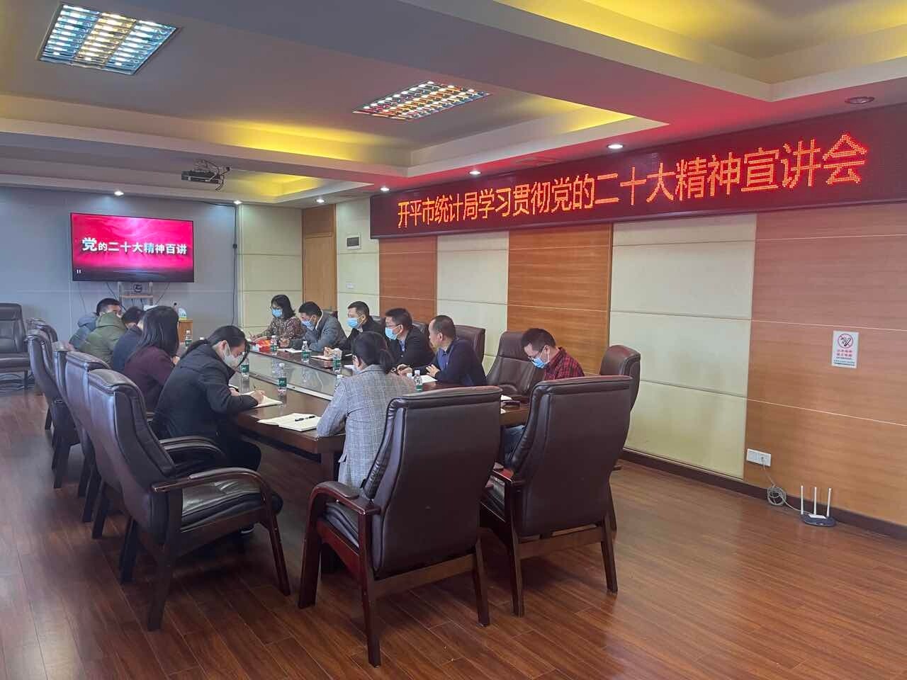 開平市統(tǒng)計局召開學(xué)習(xí)貫徹黨的二十大精神宣講會 為深入推進(jìn)黨的二十大精神的學(xué)習(xí),進(jìn)一步落實(shí)全面從嚴(yán)治黨要求,2月1日開平市統(tǒng)計局召開學(xué)習(xí)貫徹黨的二十大精神宣講會,局全體黨員參加。 宣講會首先以視頻方式組織收看了國家統(tǒng)計局“全面從嚴(yán)治黨”專題講座,中央紀(jì)委國家監(jiān)委駐委紀(jì)檢監(jiān)察組二級巡視員劉桂紅作了專題輔導(dǎo)。隨后黨組書記、局長李健鵬同志主持集體學(xué)習(xí)。與會班子成員圍繞黨的二十大提出的新目標(biāo)、新方略、新任務(wù)、新舉措,立足統(tǒng)計部門職能,就如何提高統(tǒng)計數(shù)據(jù)質(zhì)量、強(qiáng)化經(jīng)濟(jì)形勢分析研判、扎實(shí)做好各項(xiàng)統(tǒng)計調(diào)查和提高優(yōu)質(zhì)統(tǒng)計服務(wù)等內(nèi)容進(jìn)行了交流發(fā)言。 通過宣講學(xué)習(xí),全體黨員進(jìn)一步加深了對習(xí)近平新時代中國特色社會主義思想和黨的二十大精神的理解和把握,明確了新一年的工作目標(biāo),達(dá)到了相互啟發(fā),促進(jìn)落實(shí)的目標(biāo)。