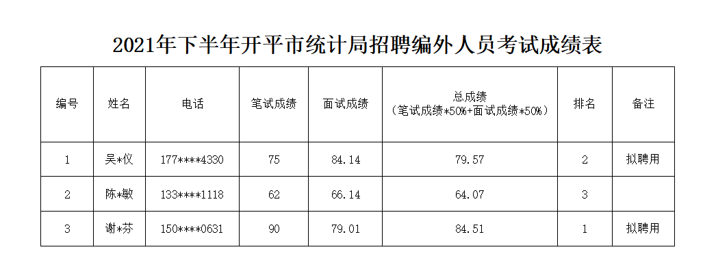 2021年下半年開平市統(tǒng)計局招聘編外人員考試成績公示 開平市統(tǒng)計局于2021年11月18日進行了公開招聘編外人員考試,現(xiàn)將考試綜合成績公示如下: 1.公示時間為2021年11月19日至2021年11月25日。對公示如有異議,請于公示期內反映情況。 聯(lián)系電話:0750-2268528甄小姐 2.根據(jù)考試成績情況,經研究決定,統(tǒng)一劃定綜合成績合格分數(shù)線為60分。總成績=面試成績*50%+筆試成績*50% 3.公示如無異議,體檢、考察的有關事項另行通知入圍應聘人員,請相關應聘人員務必保持聯(lián)系方式暢通。 開平市統(tǒng)計局 2021年11月19日
