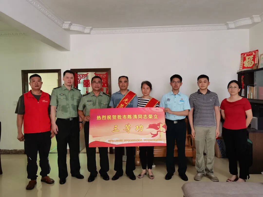 5月31日,開平市人民武裝部、市退役軍人事務(wù)局、長(zhǎng)沙街道武裝部及退役軍人服務(wù)站一行組成報(bào)喜團(tuán),來(lái)到現(xiàn)役軍人陳濤家中,將三等功喜報(bào)和慰問金送到家屬手上。長(zhǎng)沙街道黨工委委員、武裝部部長(zhǎng)何永富為家屬戴上了“光榮軍屬”綬帶,并向他們表示熱烈祝賀和崇高敬意。接過喜報(bào),陳濤家屬臉上洋溢著喜悅和自豪的笑容。報(bào)喜團(tuán)和軍人家屬進(jìn)行親切交談,詳細(xì)了解他們的身體狀況和生活情況,感謝他們?yōu)樽鎳?guó)培育出優(yōu)秀的青年,為黨和國(guó)家做出貢獻(xiàn),以實(shí)際行動(dòng)為家鄉(xiāng)增光添彩,并鼓勵(lì)他們一如既往支持孩子安心服役、建功軍營(yíng),爭(zhēng)取再創(chuàng)佳績(jī),同時(shí)叮囑他們有任何困難要及時(shí)向有關(guān)部門反映。