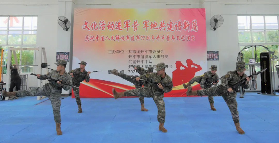 文藝演出在開平青年精彩紛呈的武術(shù)表演中拉開帷幕,長(zhǎng)笛《美麗的神話》、獨(dú)唱《白云故鄉(xiāng)》、古箏《一夢(mèng)江湖》等節(jié)目相繼上演,或鏗鏘有力,或輕快昂揚(yáng),贏得了現(xiàn)場(chǎng)觀眾陣陣掌聲。而武警開平中隊(duì)官兵帶來(lái)的擒敵拳及武術(shù)表演更是將現(xiàn)場(chǎng)氣氛推至高潮,傳遞著自強(qiáng)不息、不屈不撓的精神。最后,全體大合唱《強(qiáng)軍戰(zhàn)歌》,生動(dòng)展現(xiàn)了軍愛(ài)民、民擁軍、軍政軍民一家親的深厚情誼。