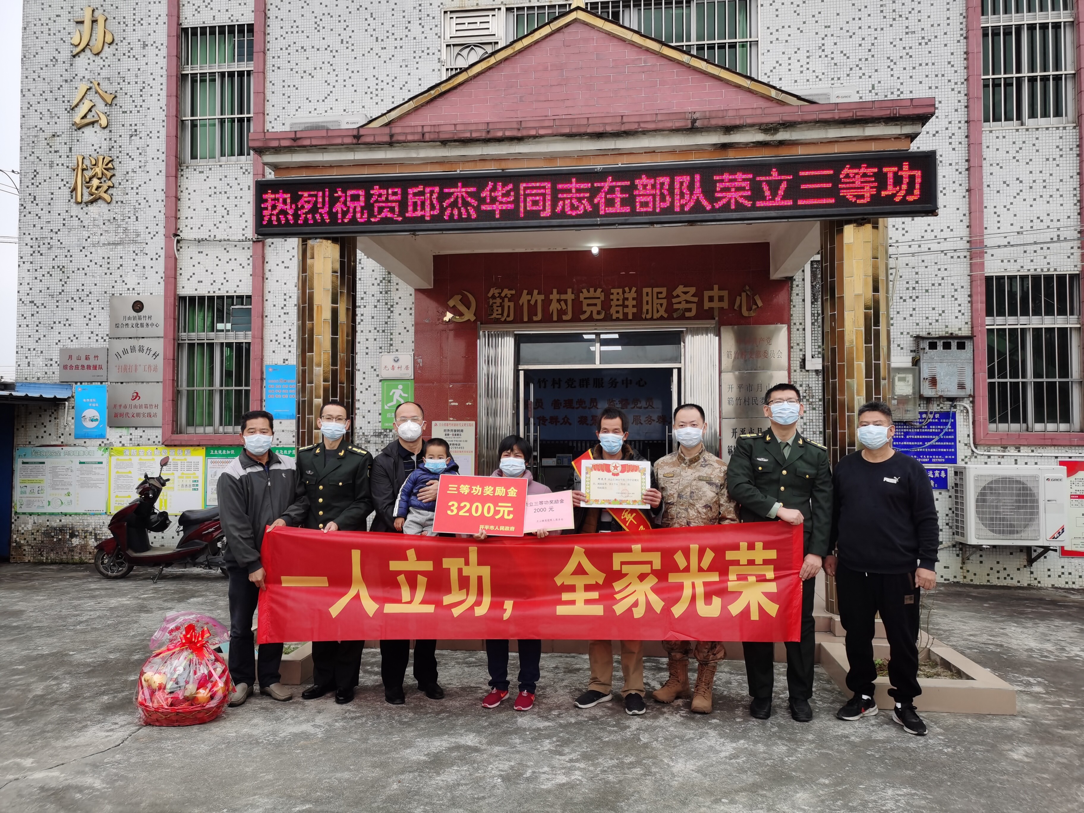 村委會門前,立功受獎軍人家庭父母佩戴大紅綬帶,手捧立功喜報和慰問金,在“熱烈祝賀邱杰華同志在部隊榮立三等功”和“一人立功,全家光榮”醒目橫幅前,同慰問組一行合影留念,現(xiàn)役軍人家庭倍感尊崇和榮光之情溢于言表。