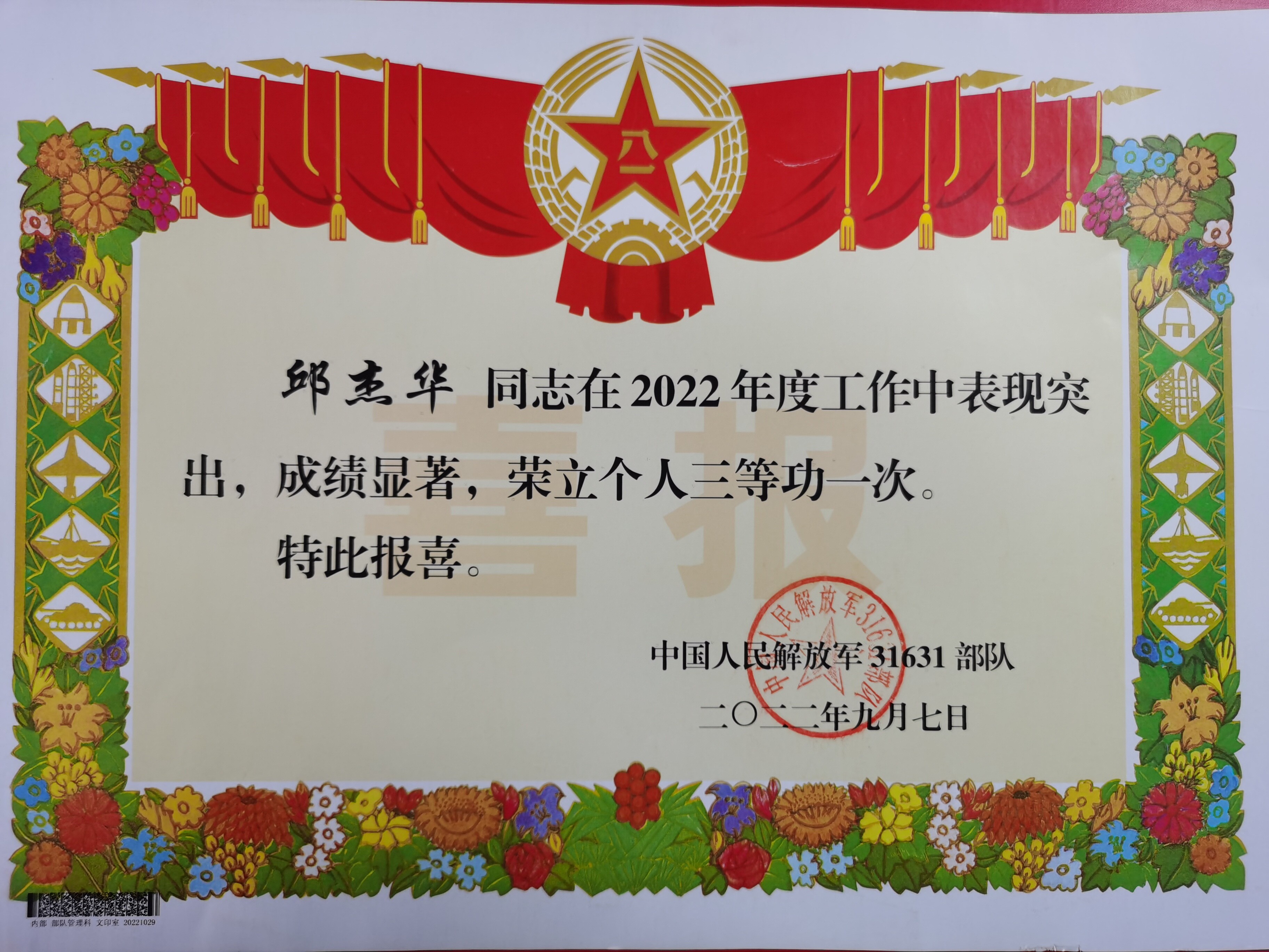 據(jù)了解,邱杰華同志于2014年9月入伍,服役于中國人民解放軍陸軍,自入伍以來,他始終堅持錘煉本領,爭做精武尖兵,因訓練工作突出,多次獲得“四有”優(yōu)秀士兵榮譽和嘉獎,此次在2022年備戰(zhàn)訓練成績突出,榮獲三等功榮譽,這些都是邱杰華同志,一步一個腳印,扎扎實實奮斗而來。
