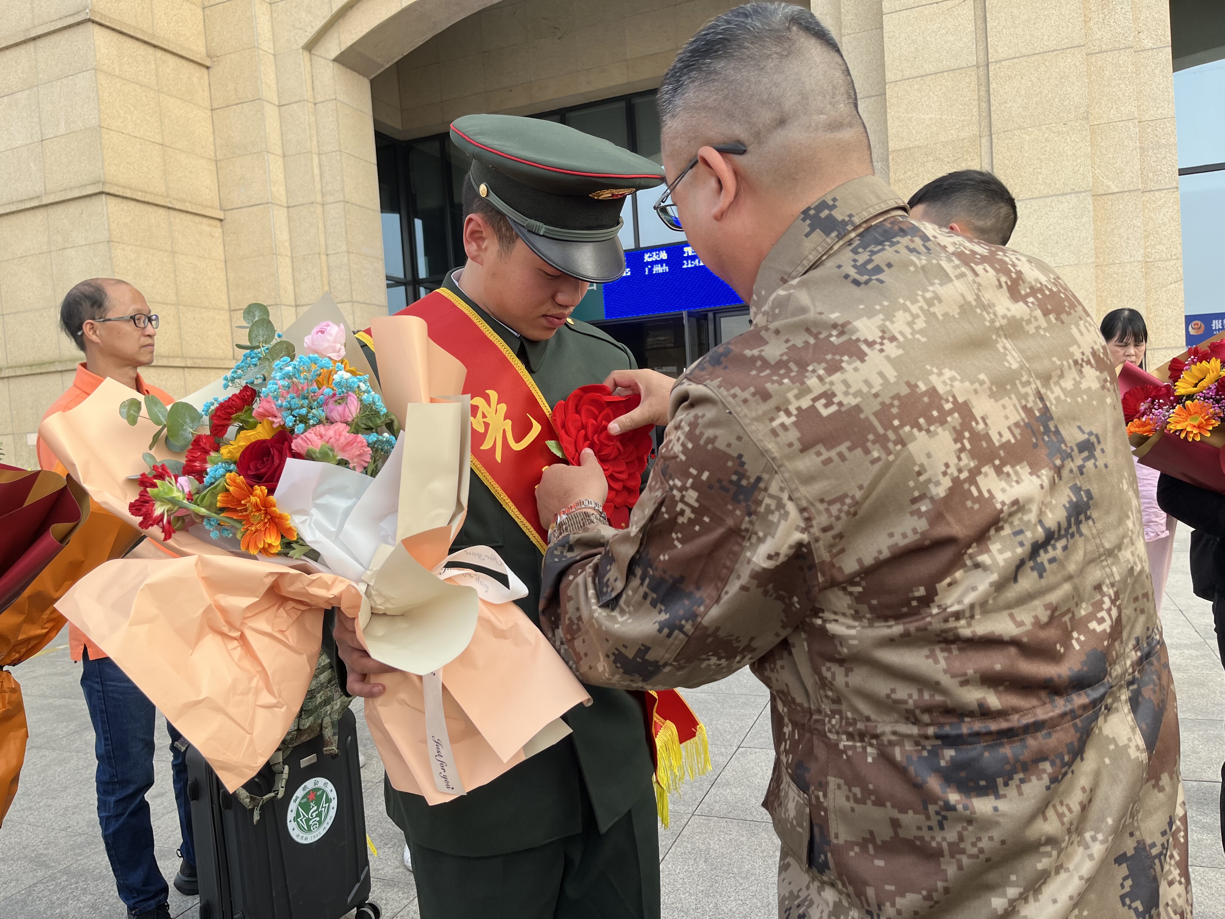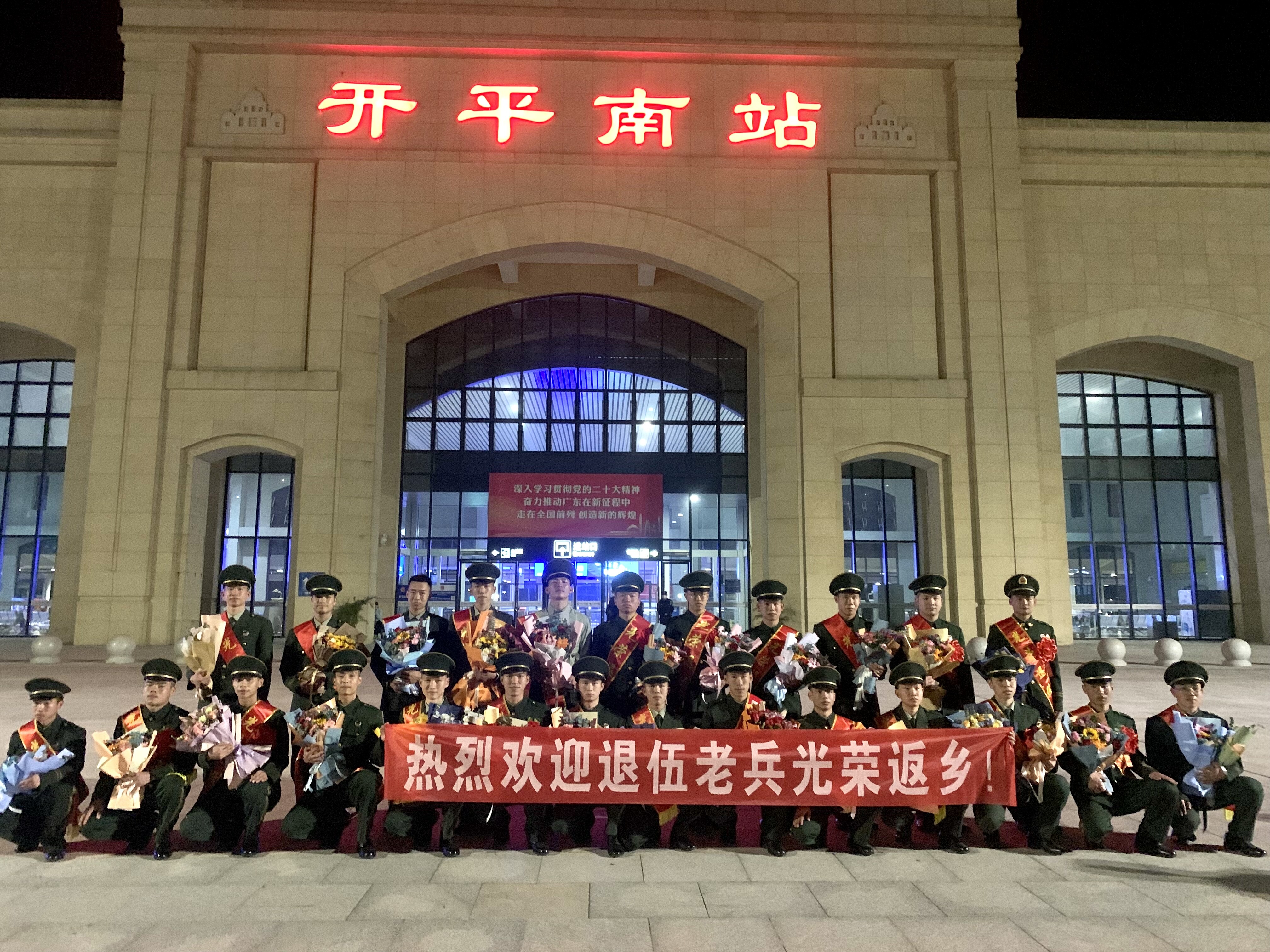 面向軍旗,立正敬禮后轉身離去;回到家鄉(xiāng),脫下軍裝投身經(jīng)濟社會建設。在那里,是無法忘懷的青春軍營;而在這里,還有等待的親朋和好友。3月1日,開平市退役軍人事務局動員各鎮(zhèn)(街道)退役軍人服務站聯(lián)動人武部組成迎接團,一起到開平南站開展迎接2023年3月退役士兵返鄉(xiāng)活動。在車站外,迎接團同眾多退役士兵親屬一道向戎歸故里的退役士兵們致以熱烈歡迎,并為他們送上綬帶和鮮花。