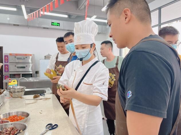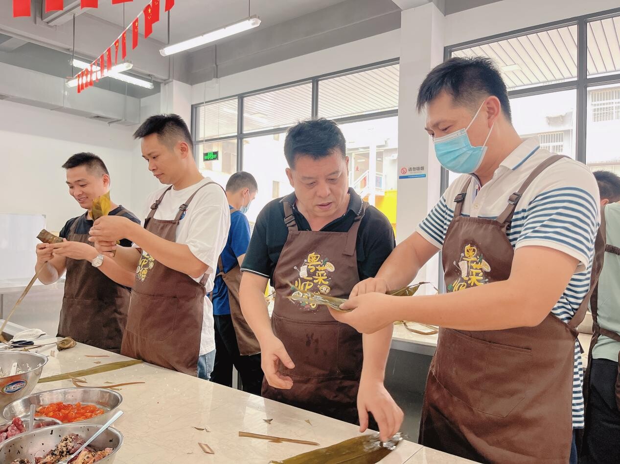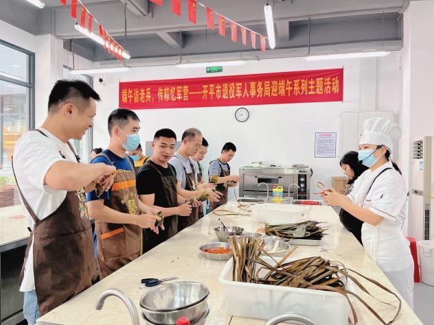 巧手裹粽展風(fēng)采。米香溢雙手,端午粽飄香。端午前夕,開平市退役軍人事務(wù)局委托開平市職業(yè)訓(xùn)練中心在廣東省粵菜師傅技能培訓(xùn)基地舉辦“迎端午、裹粽子”系列烹飪課堂。十多名退役士兵在烹飪老師的指導(dǎo)下有條不紊地包裹著軟糯咸香的粽子。卷葉折葉、裝米盛料、填餡壓實(shí)、裹葉扎繩……一雙雙忙碌的巧手穿梭在翠綠的粽葉間,濃濃的糯米香味混合清新的粽葉香氣盈滿整個(gè)烹飪教室,士兵們邊包粽子邊話情誼,互相幫助,在談笑中體驗(yàn)制作傳統(tǒng)節(jié)日美食的快樂。