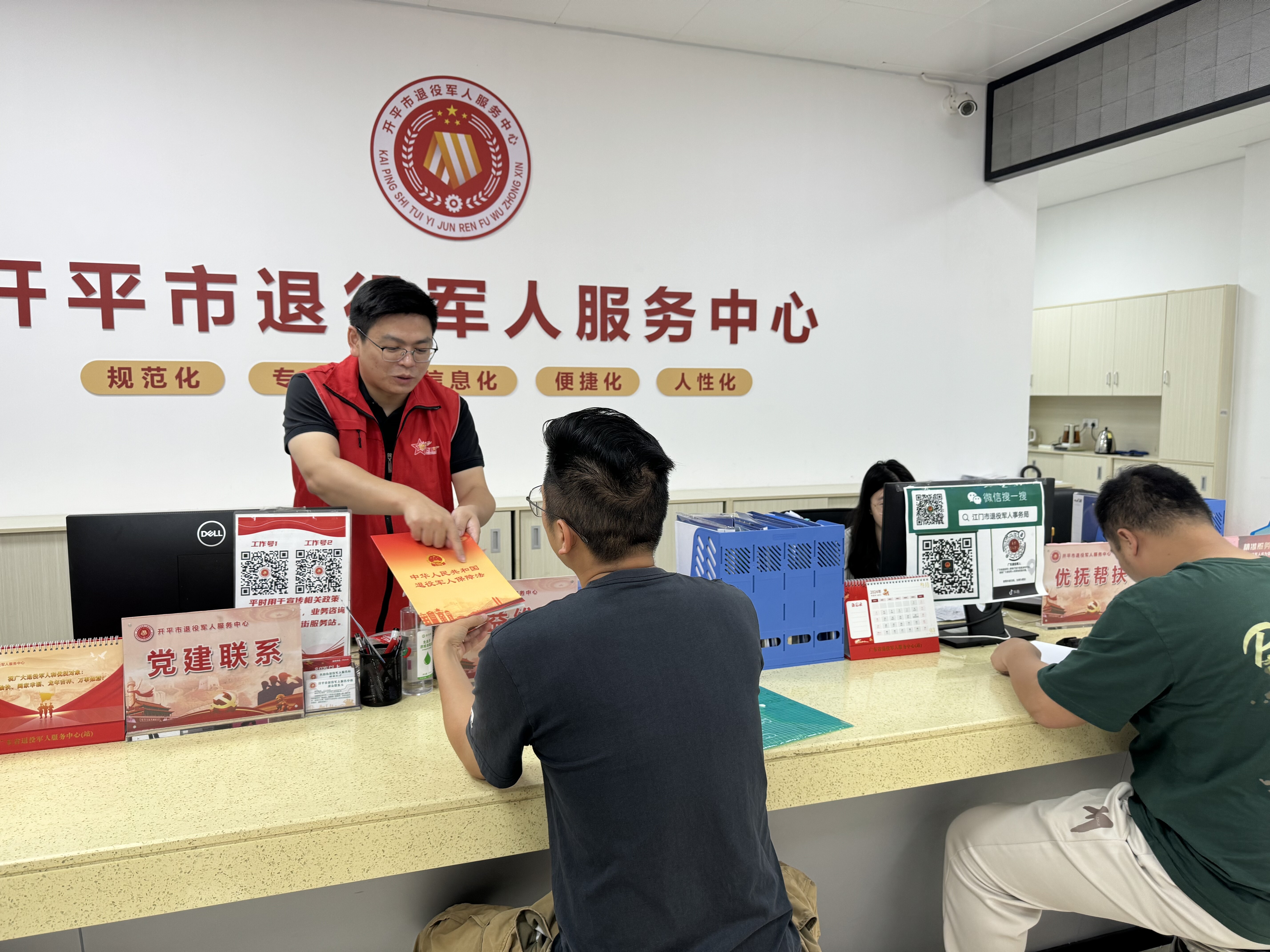 盡職小標(biāo)兵—曾煥鴻(左一):曾煥鴻自2018年入伍,2020年退役,服役于空軍部隊,自2021年起進(jìn)入馬岡鎮(zhèn)退役軍人服務(wù)站工作,曾獲評2023年度江門市最美退役軍人志愿者、2023年度江門市基層退役軍人服務(wù)站先進(jìn)工作者。