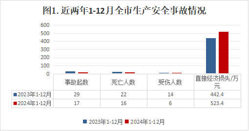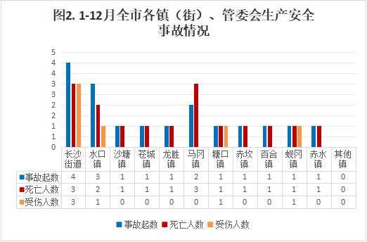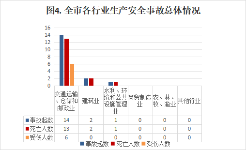 內(nèi)容摘要 2024年1-12月,全市發(fā)生生產(chǎn)安全事故17起、死亡16人、受傷6人、直接經(jīng)濟(jì)損失約523.4萬(wàn)元。 一、1-12月生產(chǎn)安全事故概況 全市發(fā)生生產(chǎn)安全事故17起、死亡16人、受傷6人、直接經(jīng)濟(jì)損失523.4萬(wàn)元,同比分別減少12起、減少6人、減少8人,增加81萬(wàn)元,事故起數(shù)、死亡人數(shù)、受傷人數(shù)、直接經(jīng)濟(jì)損失同比分別下降41.4%、下降27.3%、下降57.1%、上升18.3%。 二、各鎮(zhèn)(街)、翠山湖管委會(huì)事故情況 長(zhǎng)沙街道發(fā)生交通運(yùn)輸、倉(cāng)儲(chǔ)和郵政業(yè)事故3起,水利、環(huán)境和公共設(shè)施管理業(yè)1起;水口鎮(zhèn)發(fā)生交通運(yùn)輸、倉(cāng)儲(chǔ)和郵政業(yè)事故2起、建筑施工事故1起;沙塘鎮(zhèn)發(fā)生交通運(yùn)輸、倉(cāng)儲(chǔ)和郵政業(yè)事故1起;蒼城鎮(zhèn)發(fā)生建筑施工事故1起;龍勝鎮(zhèn)發(fā)生交通運(yùn)輸、倉(cāng)儲(chǔ)和郵政業(yè)事故1起;馬岡鎮(zhèn)發(fā)生交通運(yùn)輸、倉(cāng)儲(chǔ)和郵政業(yè)事故2起;塘口鎮(zhèn)發(fā)生交通運(yùn)輸、倉(cāng)儲(chǔ)和郵政業(yè)事故1起;赤坎鎮(zhèn)發(fā)生交通運(yùn)輸、倉(cāng)儲(chǔ)和郵政業(yè)事故1起;百合鎮(zhèn)發(fā)生交通運(yùn)輸、倉(cāng)儲(chǔ)和郵政業(yè)事故1起;蜆岡鎮(zhèn)發(fā)生交通運(yùn)輸、倉(cāng)儲(chǔ)和郵政業(yè)事故1起;赤水鎮(zhèn)發(fā)生交通運(yùn)輸、倉(cāng)儲(chǔ)和郵政業(yè)事故1起;其他鎮(zhèn)沒(méi)有發(fā)生生產(chǎn)安全事故(三埠街道、月山鎮(zhèn)、大沙鎮(zhèn)、金雞鎮(zhèn)、翠山湖管委會(huì))。 三、全市各行業(yè)事故情況 (一)各行業(yè)事故占比情況 全市共發(fā)生生產(chǎn)安全事故17起,其中交通運(yùn)輸、倉(cāng)儲(chǔ)和郵政業(yè)14起,占82.3%;建筑施工2起,占11.7%,環(huán)境和公共設(shè)施管理業(yè)1起,占5%,其他行業(yè)未發(fā)生生產(chǎn)安全事故。 (二)各行業(yè)事故基本情況 (1)農(nóng)林牧漁業(yè)。未發(fā)生事故,去年同期未發(fā)生事故。 (2)采礦業(yè)。未發(fā)生事故,去年同期未發(fā)生事故。 (3)商貿(mào)制造業(yè)。未發(fā)生事故,去年同期未發(fā)生事故。(4)建筑業(yè)。發(fā)生2起事故,死亡2人,去年同期 發(fā)生事故1起,事故起數(shù)和死亡人數(shù)同比分別上升100%、上升100%。 (5)交通運(yùn)輸、倉(cāng)儲(chǔ)和郵政業(yè)。發(fā)生事故14起(其中道路運(yùn)輸14起)、死亡13人,去年同期發(fā)生事故24起、死亡18人,事故起數(shù)和死亡人數(shù)同比分別下降41.7%、下降27.8%。 (7)水利、環(huán)境和公共設(shè)施管理業(yè)。發(fā)生1起事故, 死亡1人,去年同期未發(fā)生事故,事故起數(shù)和死亡人數(shù) 同比分別上升100%、上升100%。 (8)其他行業(yè)。未發(fā)生事故。 四、1-12月生產(chǎn)安全事故特點(diǎn) 1.道路交通領(lǐng)域安全總體平穩(wěn),但依然嚴(yán)峻。1-12月,全市發(fā)生道路運(yùn)輸事故14起、死亡13人、受傷8人,事故起數(shù)、死亡人數(shù)、受傷人數(shù)同比分別下降41.1%、下降27.8%、下降57.1%,事故起數(shù)、死亡人數(shù)實(shí)現(xiàn)“雙下降”,但是占比全市生產(chǎn)安全事故的82.3%,形勢(shì)依然嚴(yán)峻。 2.建筑施工行業(yè)安全形勢(shì)要引起重視。1-12月,全市建筑施工行業(yè)發(fā)生2起生產(chǎn)安全事故,死亡2人,事故起數(shù)、死亡人數(shù)同比上升100%、上升100%,特別是近年來(lái),涉及光伏安裝項(xiàng)目工程增多,高處作業(yè)隨之增多,安全風(fēng)險(xiǎn)也隨之增加,要引起重視,采取有效措施,開(kāi)展全方位、動(dòng)態(tài)化的風(fēng)險(xiǎn)辨識(shí)和隱患排查治理,防范行業(yè)領(lǐng)域生產(chǎn)安全事故。 3.農(nóng)林牧漁業(yè)等行業(yè)領(lǐng)域安全總體形勢(shì)平穩(wěn)。農(nóng)林牧漁業(yè)和其他行業(yè)未發(fā)生生產(chǎn)安全事故,安全生產(chǎn)形勢(shì)平穩(wěn)。 五、下一步工作措施 1.堅(jiān)持安全發(fā)展,堅(jiān)持“安全第一、預(yù)防為主、綜合治理”的方針。按照“黨政同責(zé)、一崗雙責(zé)、齊抓共管、失職追責(zé)”和“管行業(yè)必須管安全、管業(yè)務(wù)必須管安全、管生產(chǎn)經(jīng)營(yíng)必須管安全”的總要求,繼續(xù)加強(qiáng)對(duì)安全生產(chǎn)工作的領(lǐng)導(dǎo),明確職責(zé),落實(shí)責(zé)任,建立健全各項(xiàng)規(guī)章制度,進(jìn)一步強(qiáng)化安全生產(chǎn)防范措施。 2.持續(xù)深入推進(jìn)“打非治違”專項(xiàng)行動(dòng)。根據(jù)市委、市政府的安排部署,嚴(yán)格掌握標(biāo)準(zhǔn),通過(guò)突擊檢查、重點(diǎn)抽查、跟蹤檢查、聯(lián)合檢查等多種方式,有針對(duì)的嚴(yán)厲打擊非法違法生產(chǎn)經(jīng)營(yíng)建設(shè)行為。同時(shí)重點(diǎn)加強(qiáng)對(duì)道路運(yùn)輸、危險(xiǎn)化學(xué)品、建筑施工、城鎮(zhèn)燃?xì)獾阮I(lǐng)域的安全監(jiān)管,繼續(xù)實(shí)行日常監(jiān)管與重點(diǎn)檢查相結(jié)合、重要時(shí)段檢查與專項(xiàng)督查相結(jié)合的安全監(jiān)管辦法,查找和整改治理一批安全隱患,解決突出問(wèn)題,加大對(duì)生產(chǎn)過(guò)程中各類違規(guī)、違法行為的打擊力度,促進(jìn)全市安全生產(chǎn)形勢(shì