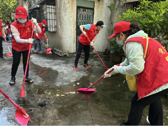 本次防控重點做好南島市場周邊人員密集區(qū)域的蚊蟲消殺和衛(wèi)生清潔工作。黨員義工們頂著炎炎烈日,手持清掃工具深入樓層樓道、街頭巷尾,對房屋周邊堆積的雜物、綠色植物隱蔽的垃圾、下水道淤積的污水進行全面清理。在行動過程中,黨員義工們還對居民家中的花盆、儲水容器等容易積水的地方及時清除;針對一些衛(wèi)生黑點,通過翻墻爬梯進行到底,深入清潔,清除的垃圾一袋接一袋、清理的積水一盆接一盆,盡最大的努力履行好防控責(zé)任和使命。