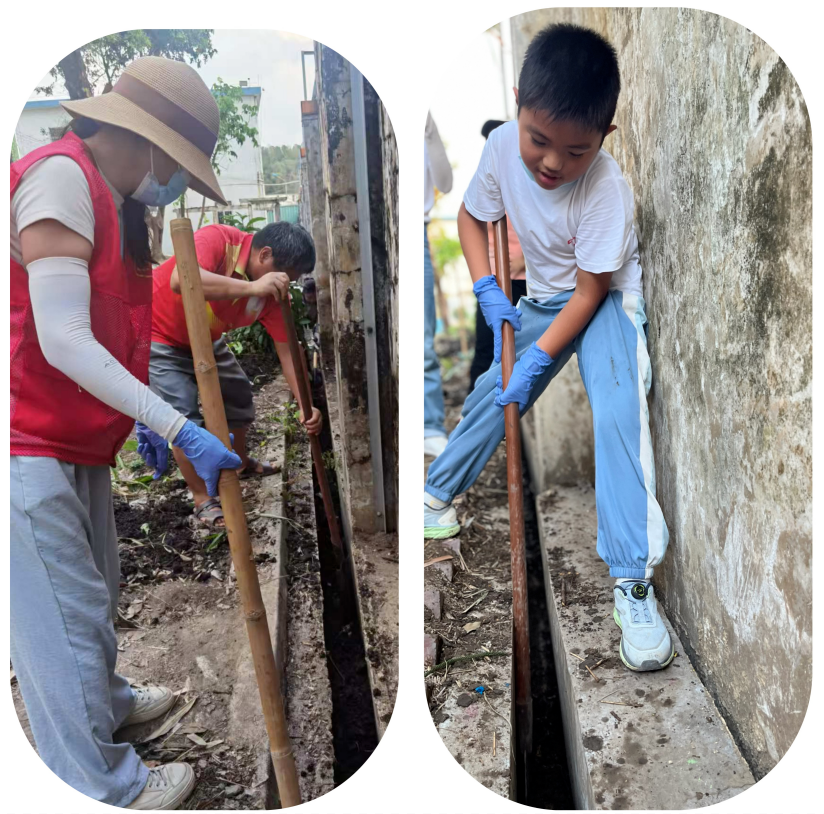赤坎鎮(zhèn)五龍學(xué)校學(xué)生與家長(zhǎng)一起清理屋外雜草