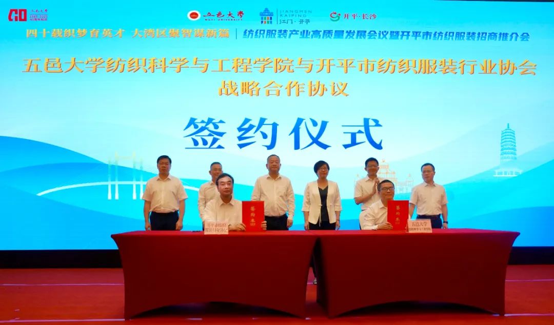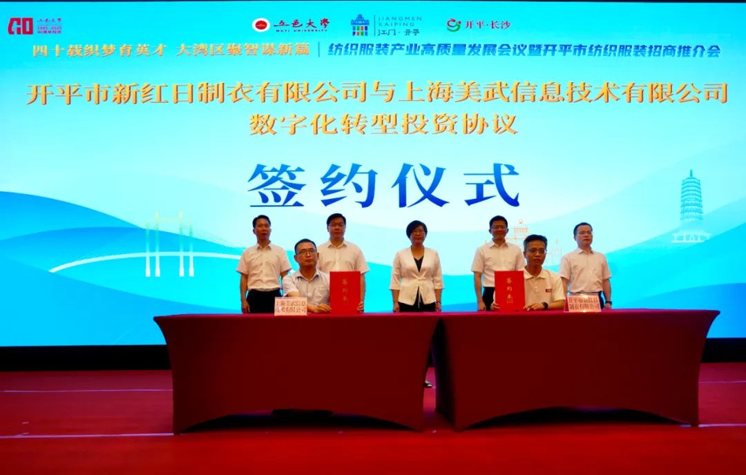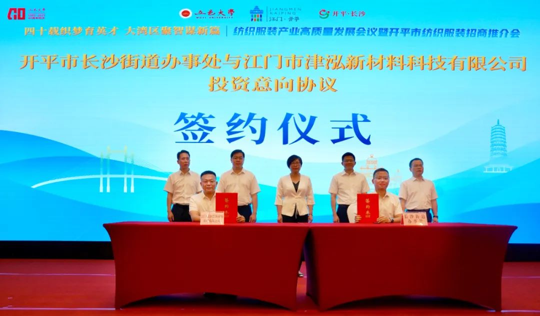 在現(xiàn)場舉行的簽約儀式上,五邑大學(xué)紡織科學(xué)與工程學(xué)院與開平市紡織服裝行業(yè)協(xié)會簽訂人才培養(yǎng)戰(zhàn)略合作協(xié)議;長沙街道辦事處與江門市津泓新材料科技有限公司簽訂投資意向協(xié)議;開平市新紅日制衣有限公司與上海美武信息技術(shù)有限公司簽訂數(shù)字化轉(zhuǎn)型投資協(xié)議,為開平紡織產(chǎn)業(yè)人才儲備、技術(shù)升級及全鏈條高質(zhì)量發(fā)展注入強勁動能。