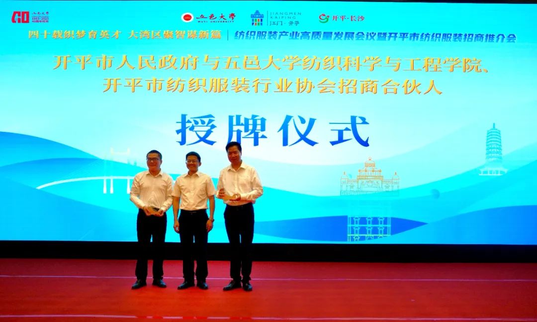同時,開平市向五邑大學(xué)紡織科學(xué)與工程學(xué)院、開平市紡織服裝行業(yè)協(xié)會授予“招商合伙人”牌匾,精準(zhǔn)賦能開平紡織產(chǎn)業(yè)鏈招商;五邑大學(xué)向開平市紅日制衣有限公司授予“五邑大學(xué)校外實習(xí)基地”牌匾,進一步促進人才培養(yǎng)與實踐教學(xué)的雙向融合。